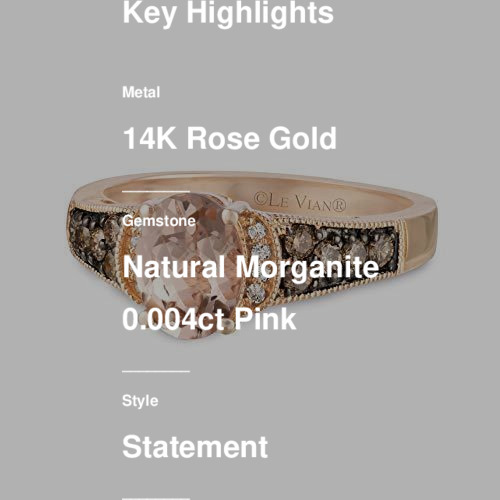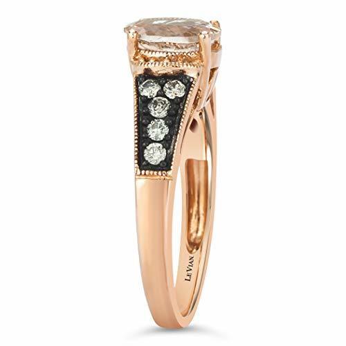 The Le Vian Grand Sample Sale is here again with incredible mark-downs! This sophisticated ring from the Le Vian Chocolatier collection is the perfect gift for yourself or a loved one. The luminous ring features an oval cut Pink Morganite in a four prong setting bracketed on both sides by crescents of White Diamonds. The ring has a tapered shank edged in milgrain and filled with Chocolate Diamonds offset by black rhodium plated settings that make their color pop. The cathedral style ring has a simple openwork gallery. The spectacularly original ring is hand-crafted from 14K Rose Gold. This fashionable ring will make an excellent engagement ring, birthday present, promise ring, or statement ring. Grab it while it’s still available!