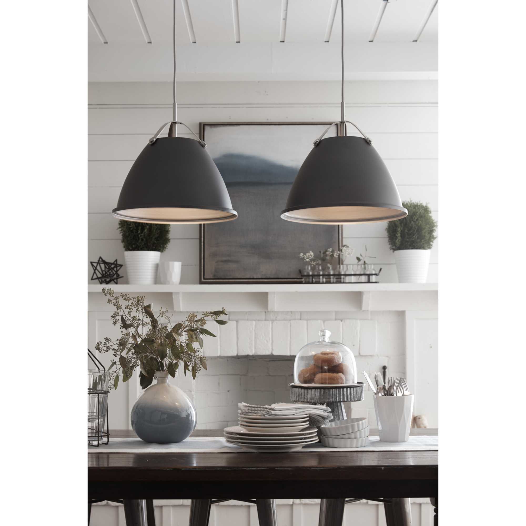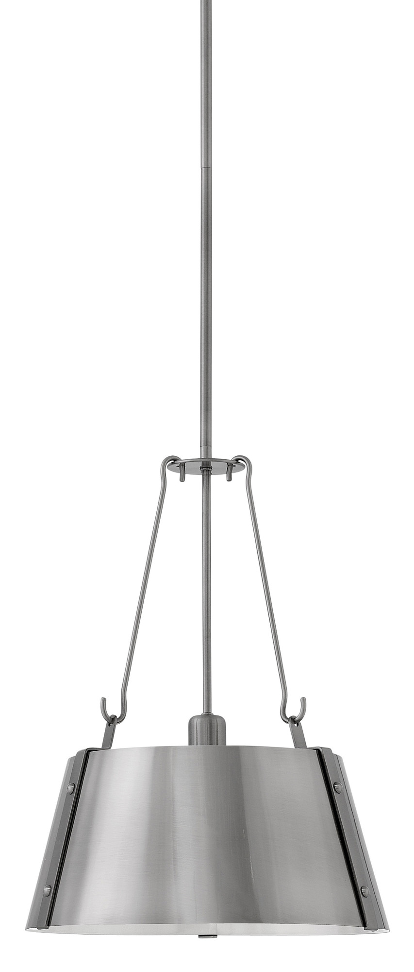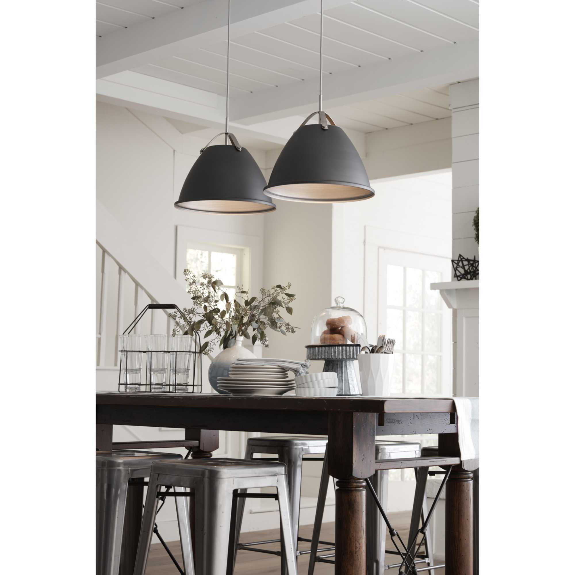 Item DescriptionTre is a classic metal shade 15" pendant with an updated combination of either a Graphite dome and Brushed Nickel accents or a White dome and Polished Chrome accents. A tri-arm support adds a sense of architectural and industrial detailing, while the vented shade allows for both downward and upward illumination. Light reflects off the inside of the Vintage Silver shade to provide the final finish effect.