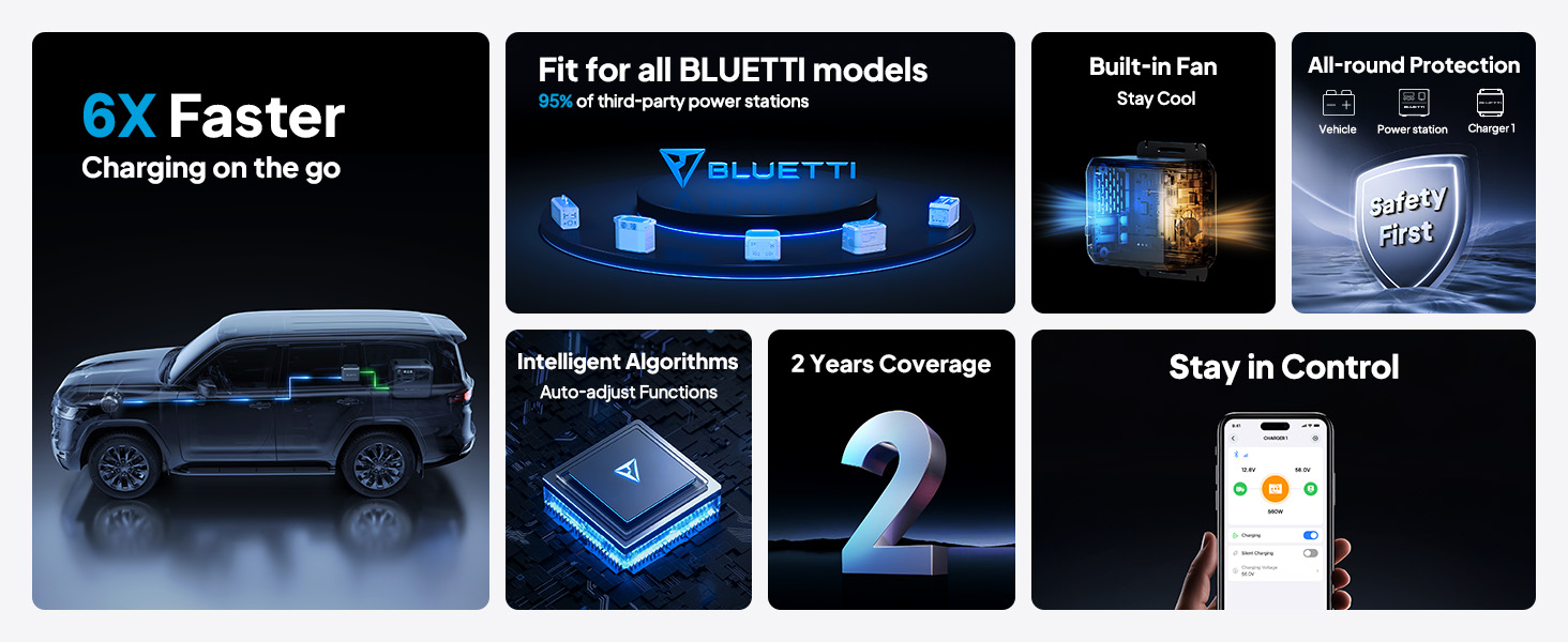 A: Charger 1 features an intelligent algorithm that monitors the connected battery. It automatically stops drawing power from your car's battery 3-6 seconds after the engine is off, preventing battery drain. While the engine is running, Charger 1 remains active and can be controlled through the BLUETTI app, allowing you to start and stop charging your power station as needed.