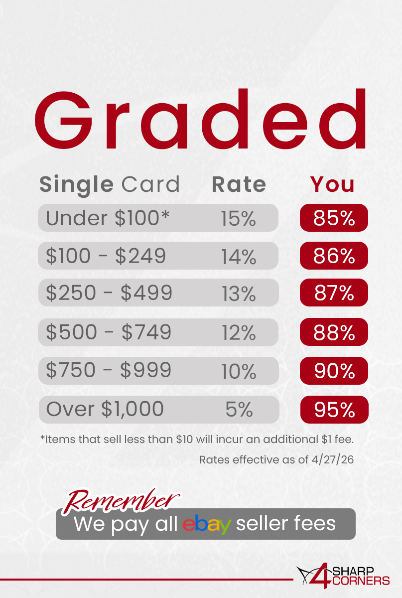 4SC Elite identifies visually stunning cards that are among the very finest examples for their assigned grade. Since its debut, items deemed to be 4SC Elite have consistently seen higher auction prices compared to their non-4SC Elite counterparts, in some cases greatly higher. Look for 4SC Elite listings already in circulation and consign your best cards for a chance to receive this prestigious designation. The 4SC Elite designation is not available for purchase and will be granted only at the discretion of the experts of 4 Sharp Corners. Message us today to learn more.