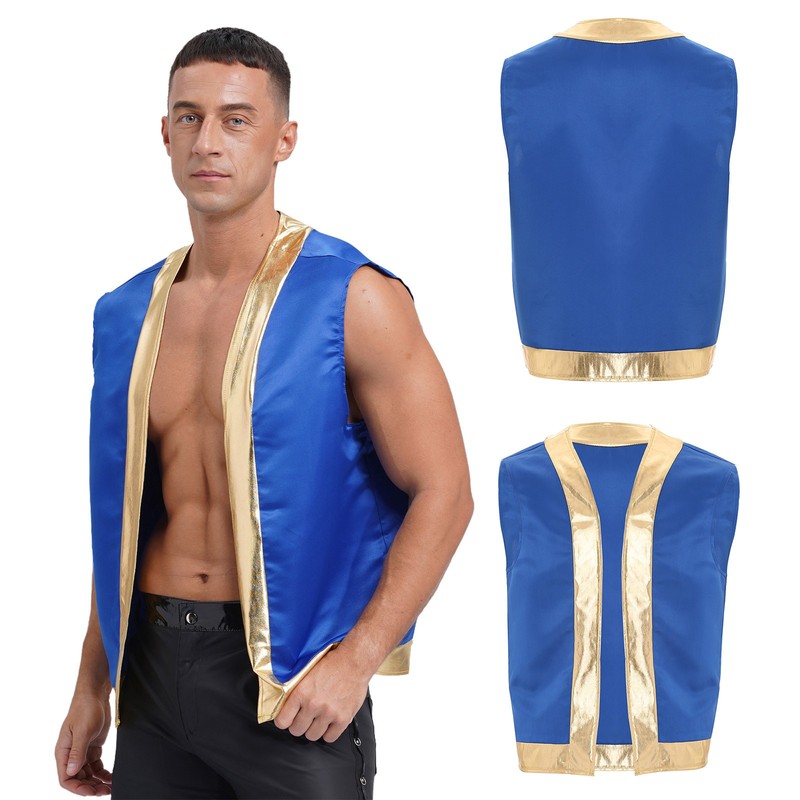 Designed with open front, sleeveless, stylish metallic shiny trim and loose fitting, contrast vest is a perfect costume for cospaly party.