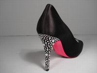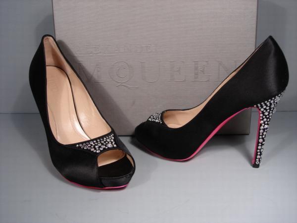These new ALEXANDER MCQUEEN high heel platform peep toe pumps in black satin are so striking. The crystals at the toe and heel are so pretty. The crystals come in varying sizes and heights.