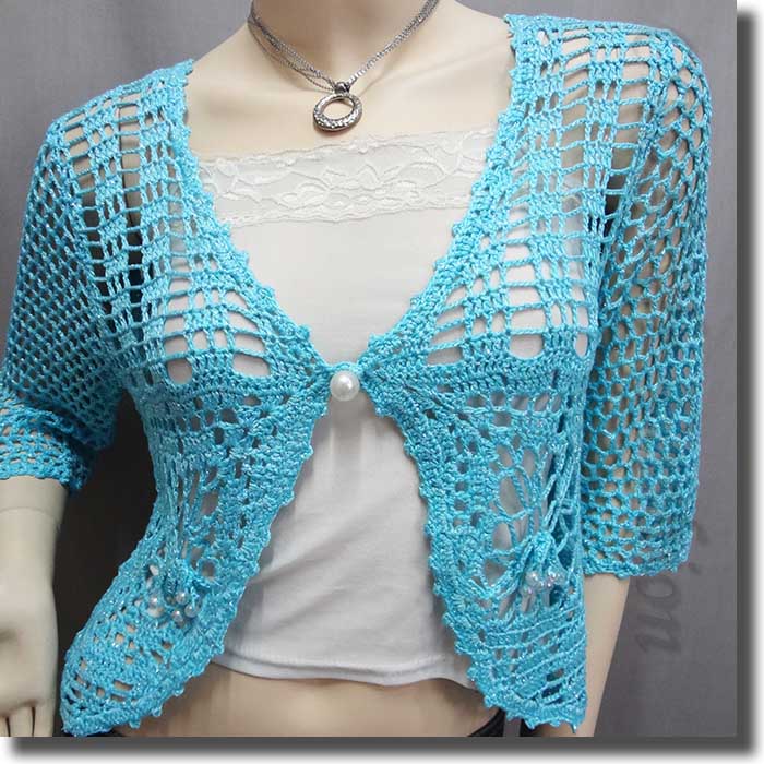 A beautiful and chic cardi / bolero / shrug top. Full front open with pearl like button closures. Silvery threads twisted in threads. Decoration with spreading beads at both sides in lower areas adding more charming effects. Scallop hem. Girlie and lovely.