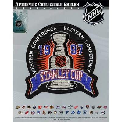 This is the patch for the 1997 Stanley Cup Finals, played between the Philadelphia Flyers and Detroit Red Wings. As worn by the players during the Cup. This patch is designed for commemorative, nostalgic display, and collection. The patch measures approximately at 4.5" wide X 4.25" tall. Patch comes fully packaged and sealed.