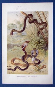 1896 Natural History Chromolithograph Print Personally Removed from 19th Century printing of Lydekker's Natural History Captioned "Rat-Snake and Cobras" Artist Signed: P.J. Smit Striking colors performed by multi-stone lithographic process Overall Size 6.5" by 10.2"