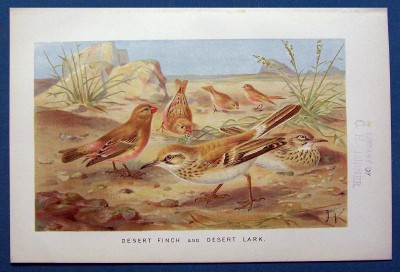1896 Natural History Chromolithograph Print Personally Removed from 19th Century printing of Lydekker's Natural History Captioned "Desert Finch and Desert Lark" Striking colors performed by multi-stone lithographic process Overall Size 6.5" by 10.2"