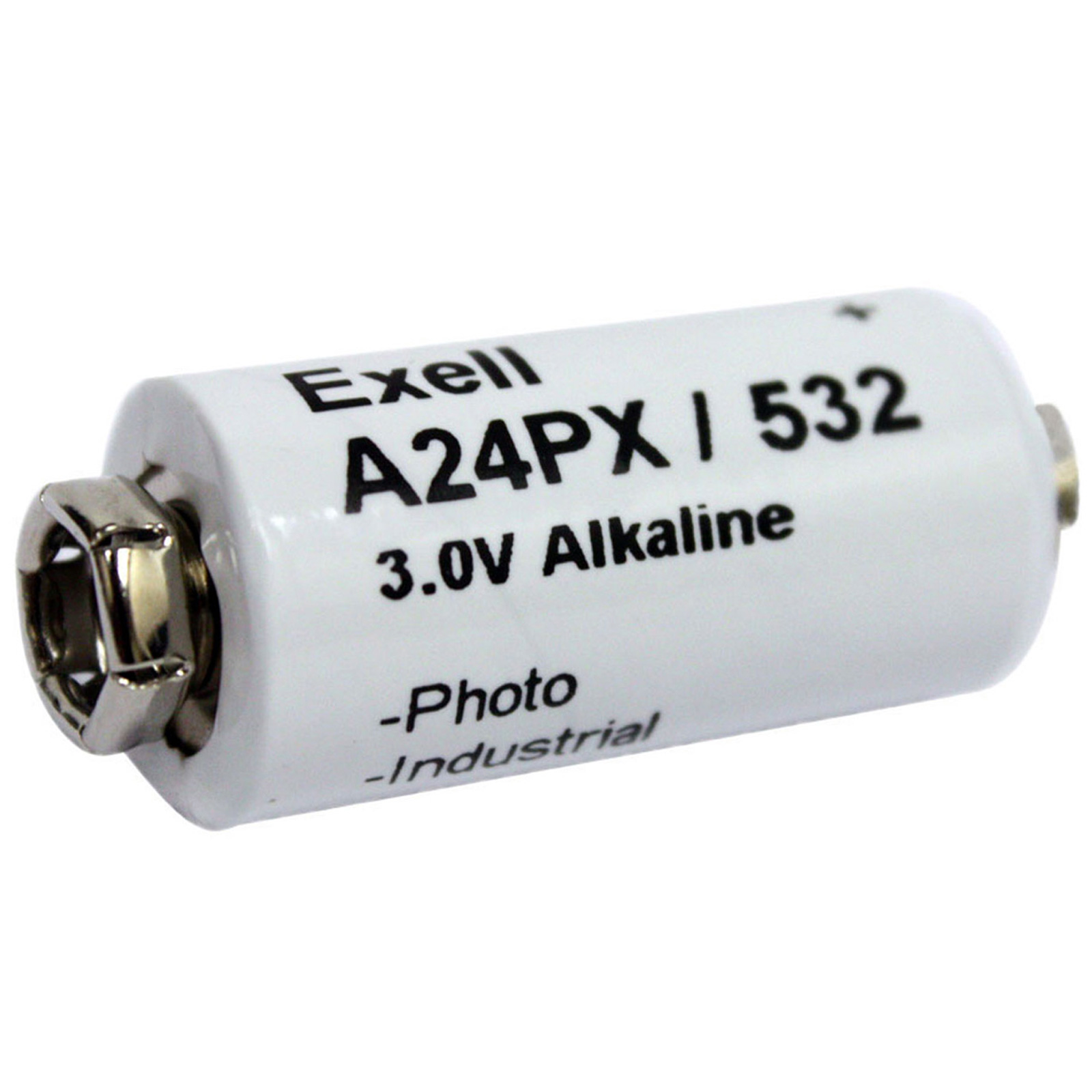 The 24PX or 532 is an unusual cell often used in older Polaroid cameras. It is a cylindrical battery with one large snap connector at each end.