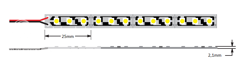 CARATTERISTICHE - Tipologia led: smd 3528 - Numero led: 300 - Alimentazione: DC12V - Consumo: 2A - 24W - Dimensioni: 2500x10x2,1mm Viewing Angle: 120° Protezione: IP20 (uso interno) - Durata: 50.000 ore circa - Prodotto certificato Italia: CE