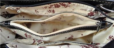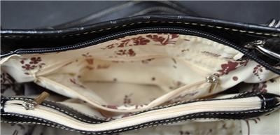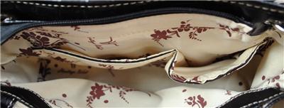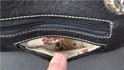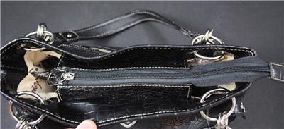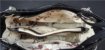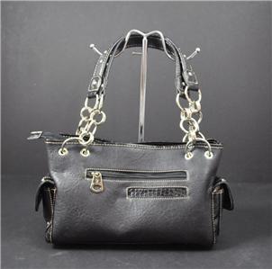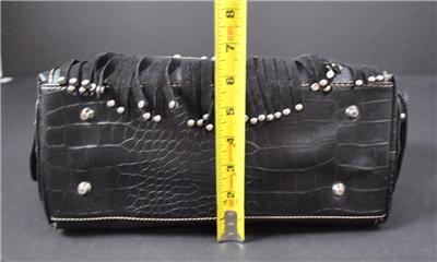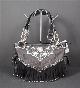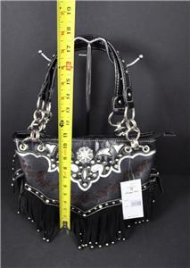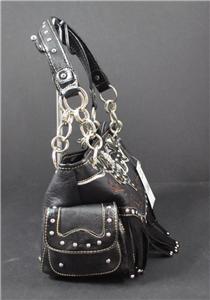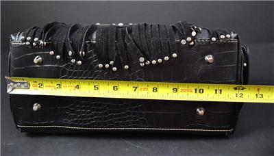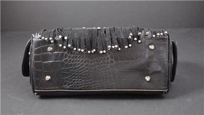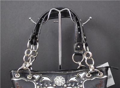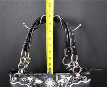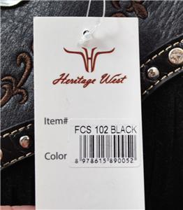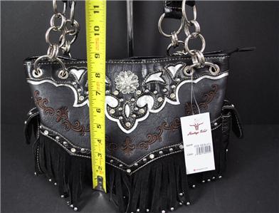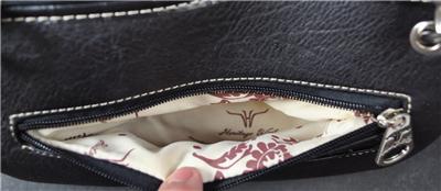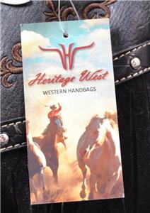This is a NWT (new with tag) Heritage West black with silver trim, double straps, studs, and rhinestone concho handbag. The exterior has a top zipper closure, two snap side pockets, a back zipper pocket, a small open pocket for a smart phone and four studs on the bottom. It has silver tone hardware and white stitching trim that has an even quality as on other high end handbags. Inside there is fabric lining, two zipper pockets and two open multi-functional pockets. The material has texture and is light, soft and flexible. It can occasionally be cleaned with a quick wipe. You can use a soft cloth dipped in a solution of mild warm water. This simple care ensures a longer life of the bag making it nearly as durable and reliable as leather!!!!