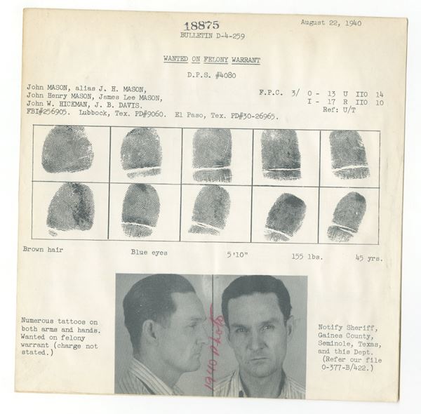 Original Wanted Notice, dated August 22, 1940, from Topeka, Kansas for information leading to the apprehension of John Mason, wanted on an unspecified felony warrant. Notice features printed copies of mug shot photographs and fingerprints.