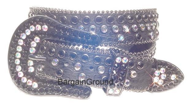 BELT is made of genuine leather. One row of AB rhinestones in the middle, one row of black rhinestone on one side and one row of black rhinestone and AB rhinestone on the other side. Small studs are all around the edge of the belt.