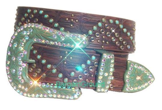 BELT is made of leather. Turquoise stone, rhinestones and studs are around the belt.