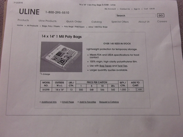 2500 14” x 14” Polyethylene Bags from Annie Anne’s The Product: We are selling a large box contains 2500 14” x 14” polyethylene bags. We do not know the thickness of these bags because there is no specifications on the box. We are guessing it’s either 1 mL or 2 mL thick. We got these when the East Coast distribution center for Annie Anne’s relocated and an auction was held. Research: We could not find these exact bags on the Internet so we went to the Uline website and found something similar. The website and our bags are the same dimension and we chose the thinnest bags we could find on the Uline website which were 1 mL thick to compare ours against. Layout of pictures: The first picture shows the contents of the box. The white piece with the three holes in it I believe is used for hanging purposes on a counter to facilitate one hand operation. The second and third picture shows one bundle. The fourth picture shows the label on the box. The fifth picture is of the Uline website that we think is comparable. Please note that 1 mL was the thinnest bags we could find and that’s what we’re comparing against. Ours may be 2 mL but we have no way of verifying that Condition: New. Packaging may have some minor damage. Pricing: As you can see in the fifth picture but you may not be able to read it, Uline sells the size bag and cartons of 1000 for $42 but you have to buy 20 cartons to get that price. We are selling 2500 of these. |