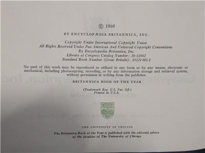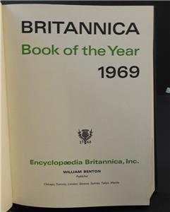 This is a vintage hardcover book titled Britannica Book Of The Year 1969 and published by Encyclopedia Britannica, Inc. This book is in good vintage used condition!!!!