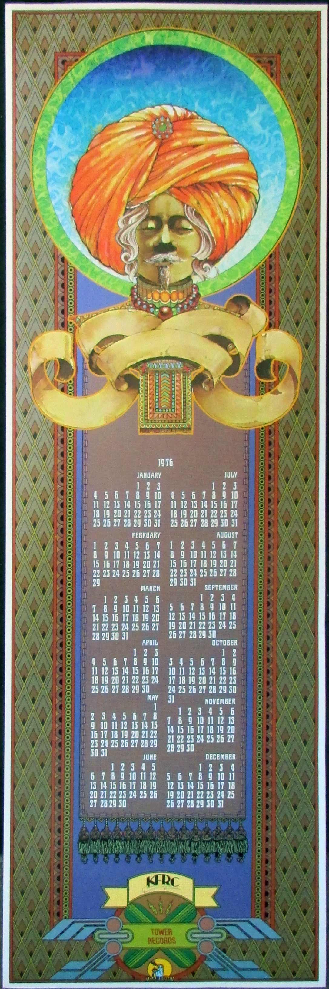 This original printing was published by Tower Records in 1976. This are pretty scarce. Artwork by Frank Carson. These calendars were created by Tower and used to partner with a radio station, usually one in each of their retail markets. This one, which we call " Turban" just to help keep track, was created for the San Francisco Bay Area and features the late, great KFRC.