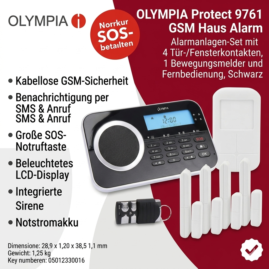 Das Olympia Protect 9761 ist ein drahtloses GSM Alarmanlagen-Set, welches viele Vorteile bietet. Zum einen verfügt es über eine Notruf- und Freisprechfunktion, was im Falle eines Alarms eine schnelle Reaktion ermöglicht. Das Set besteht aus einer Basiseinheit, Tür- und Fensterkontakten, einem Bewegungsmelder, einer Fernbedienung, Batterien und einem Netzadapter.