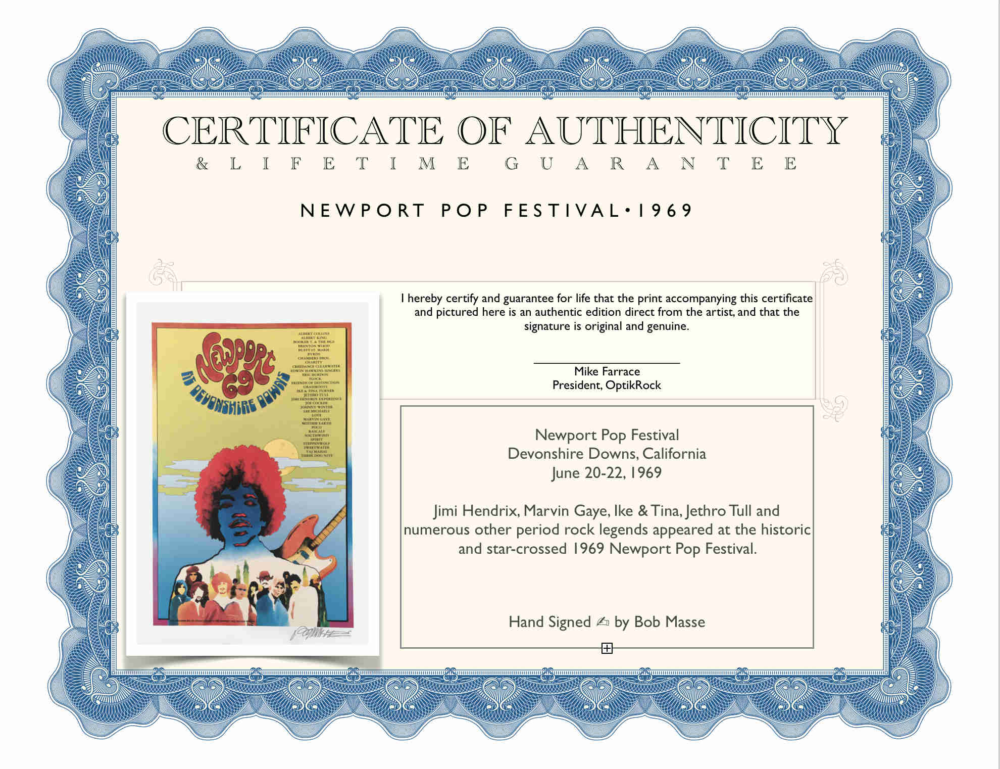 1969 Newport Pop Festival poster. This is a full-sized artist's edition of Bob's Newport 1969 Pop Festival poster, newly published and signed by Bob.