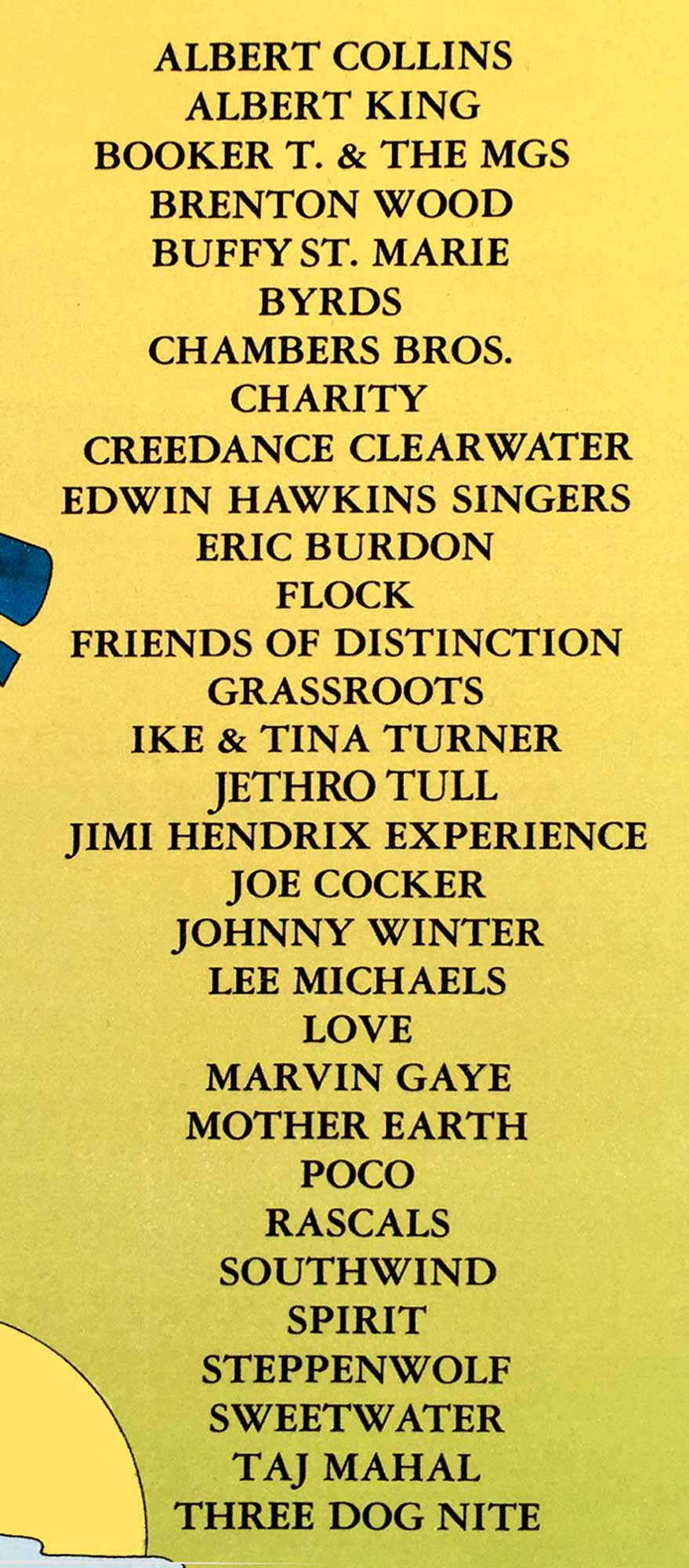 Jimi Hendrix, Marvin Gaye, Jethro Tull many more (see roster below)