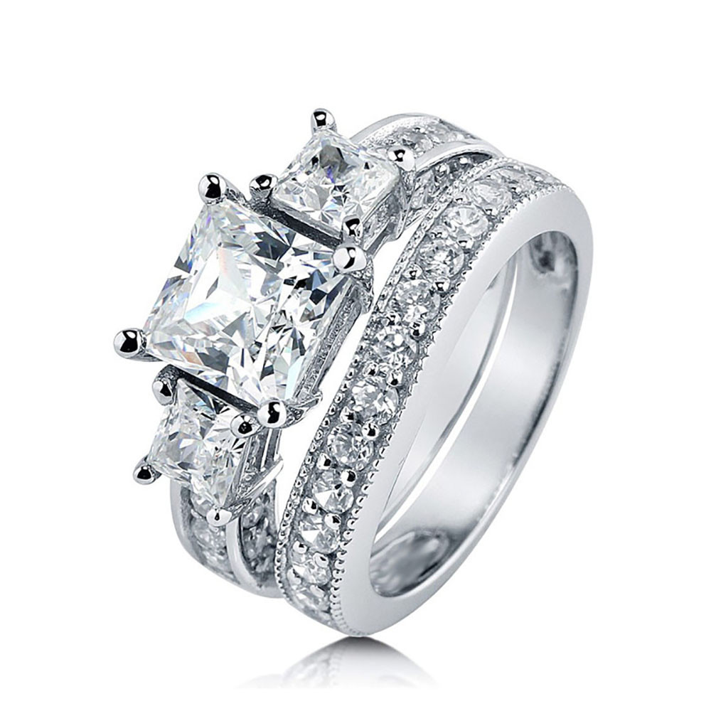 Sterling Silver 925 CZ PrincessCut 3 Stone Engagement Ring Wedding Band Set Sizes 5-10
