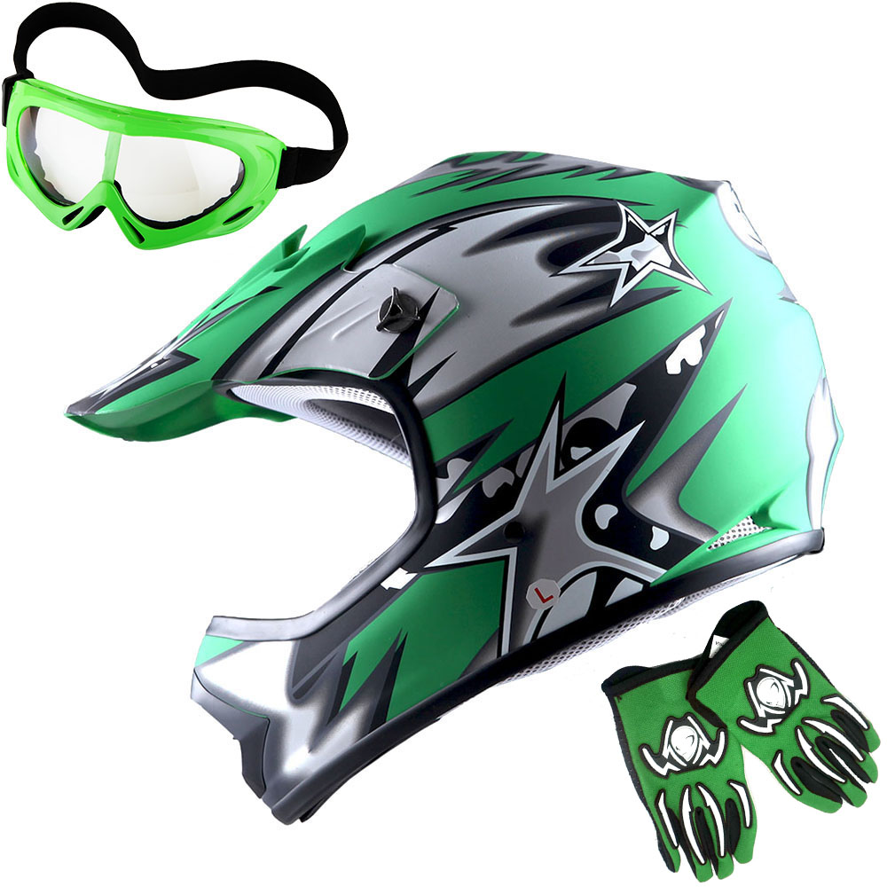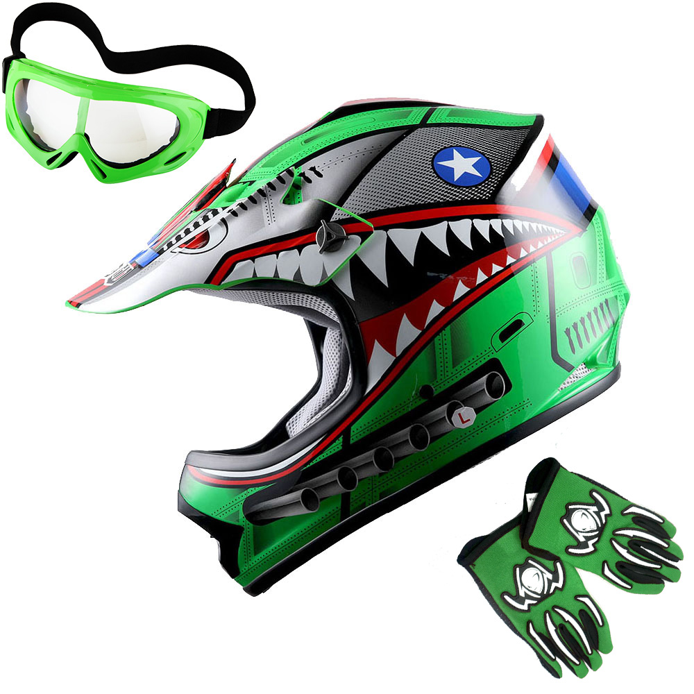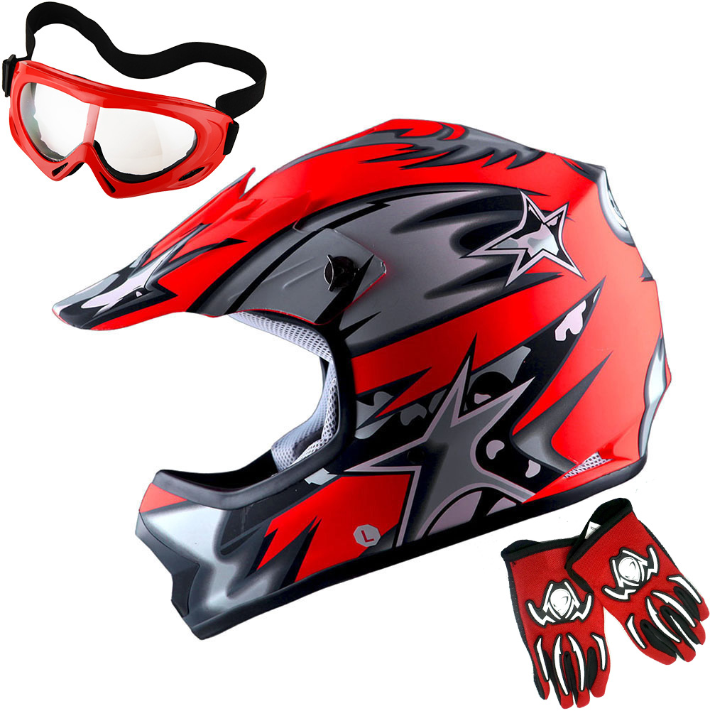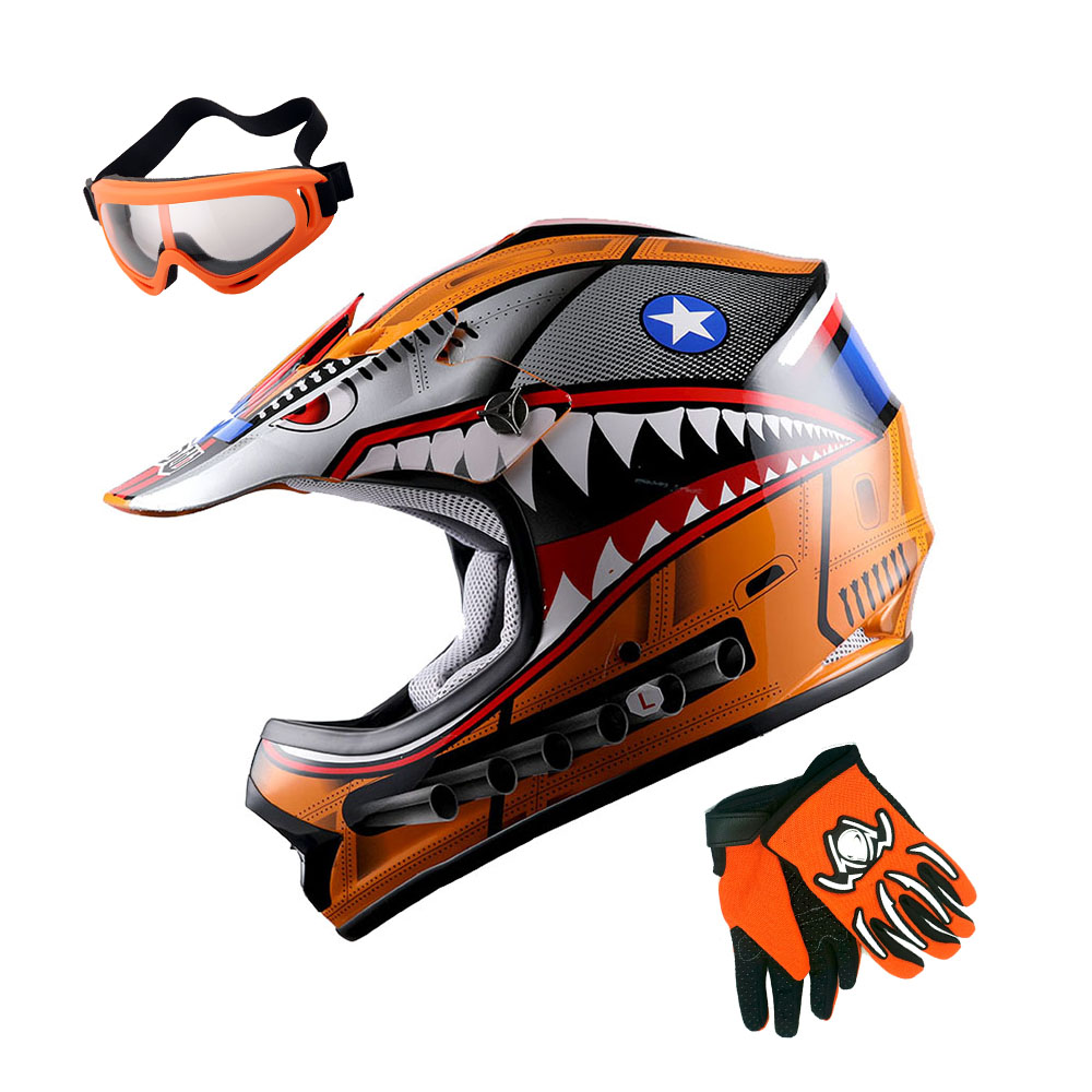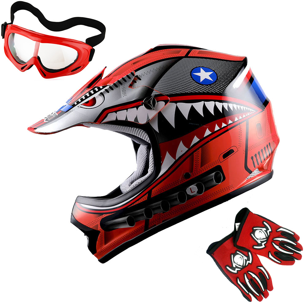 WOW Youth Kids Motocross BMX ATV Dirt Bike Helmet HBOY + Goggles + Gloves Package Includes: One Youth MX Youth Helmet + One Pair of MX Goggles + One Pair of MX Gloves; (Please make sure to check the size chart below for the right glove size and helmet size before ordering) |