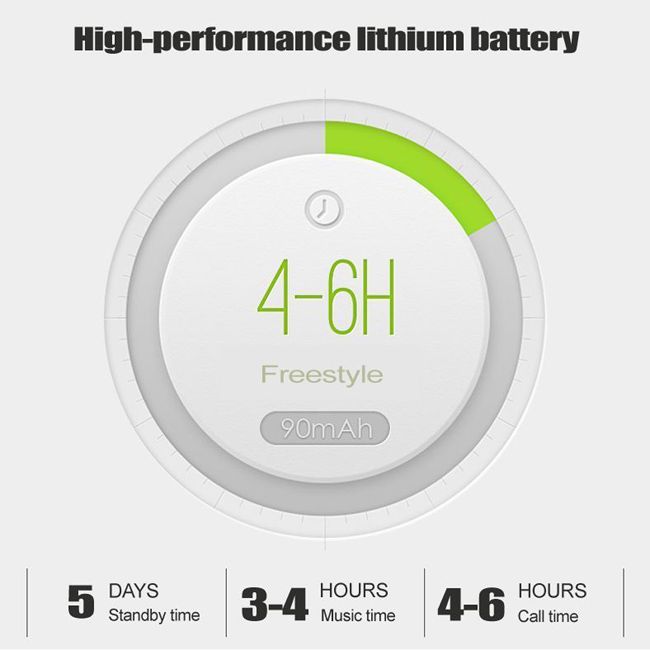 Standby Time: up100 hours Play/Call Time: 5-6 hours Bluetooth chip: 4.2 Battery capacity: 90mah Weight: about 0.25 OZ Scope of operation: within 10 meters Function: supporting high definition call, listening to music, integrated key, voice call reminder, electricity display and other functions. Application: Android, iso5.0, WP system, suitable for all Bluetooth devices,(including all Bluetooth - enabled mobile / TV / computer / tablet computers)