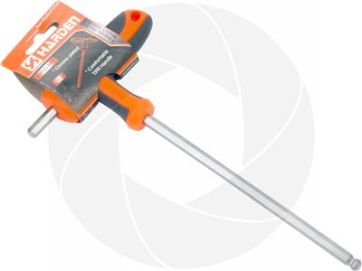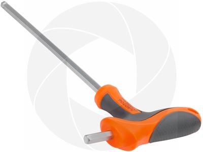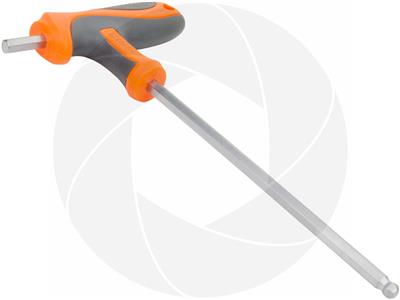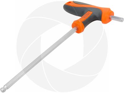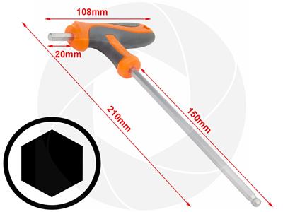 H6 six point hexagon with 6mm solid tip and round ball tip. T-Handle design for easy control and comfortable use. Made of chromium-vanadium steel with thermoplastic rubber anti-slip handle. The hexagon ball design allows to deflect for up to 30 degrees from being 90 degrees parallel to the screw head, this helps to reach bolts in difficult to get to arias. Small straight tip and long leverage rod structure allow applying extra torque to the screw head.