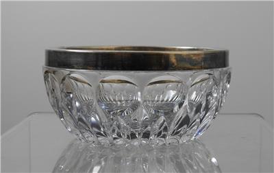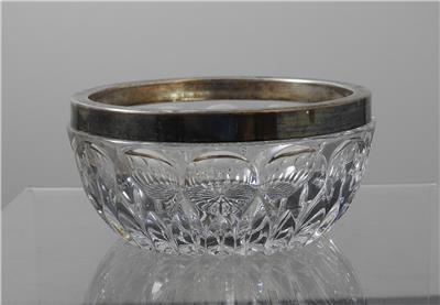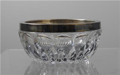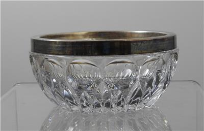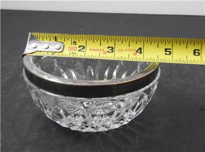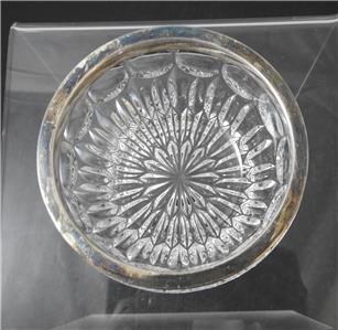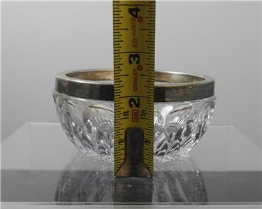 This is a vintage clear crystal glass dish or bowl with a silver plate rim. It is about 4 1/2 inches across. There are not any chips or cracks!!!!