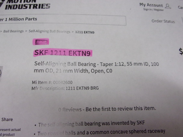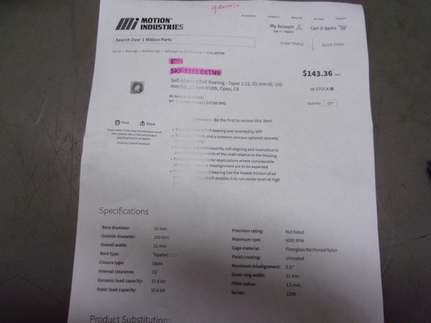 Self-Aligning Ball Bearing by SKF-Part #SKF 1211 EKTN9 The Product: Self-aligning ball bearing by SKF. Research: This is part #1211 EKTN9. We found this listed on the Motion Industries website. Layout of pictures: The first picture shows everything included in this listing. The second picture shows the bearing up close. The third picture shows the part number on the packaging. The last two pictures show the listing we found on the Motion Industries website. Condition: This is new and in the packaging. It looks like it has been sitting in a warehouse for some time. Pricing: This is listed on the Motion Industries website for $143.36. |