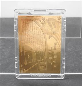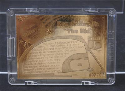 This is a Pro Mint Ken Griffey Jr. "The Kid" 22K gold gilt collectible sport trading card numbered 007701. It is in a sealed clear plastic case and is about 4 1/4 inches long. This is in good vintage used condition!!!!