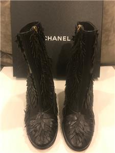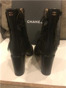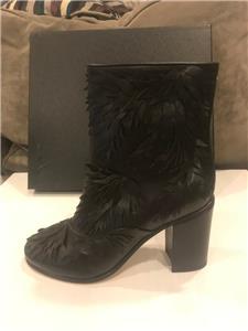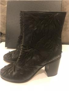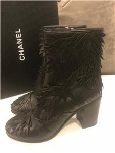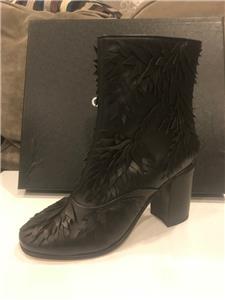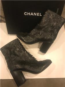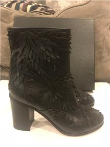 Black leather short boots with leaf detail. Side zip. Goldtone CC logo in the back. 3" leather covered block heel. Padded leather insole. Leather sole. Made in Italy. Shaft measures 5".