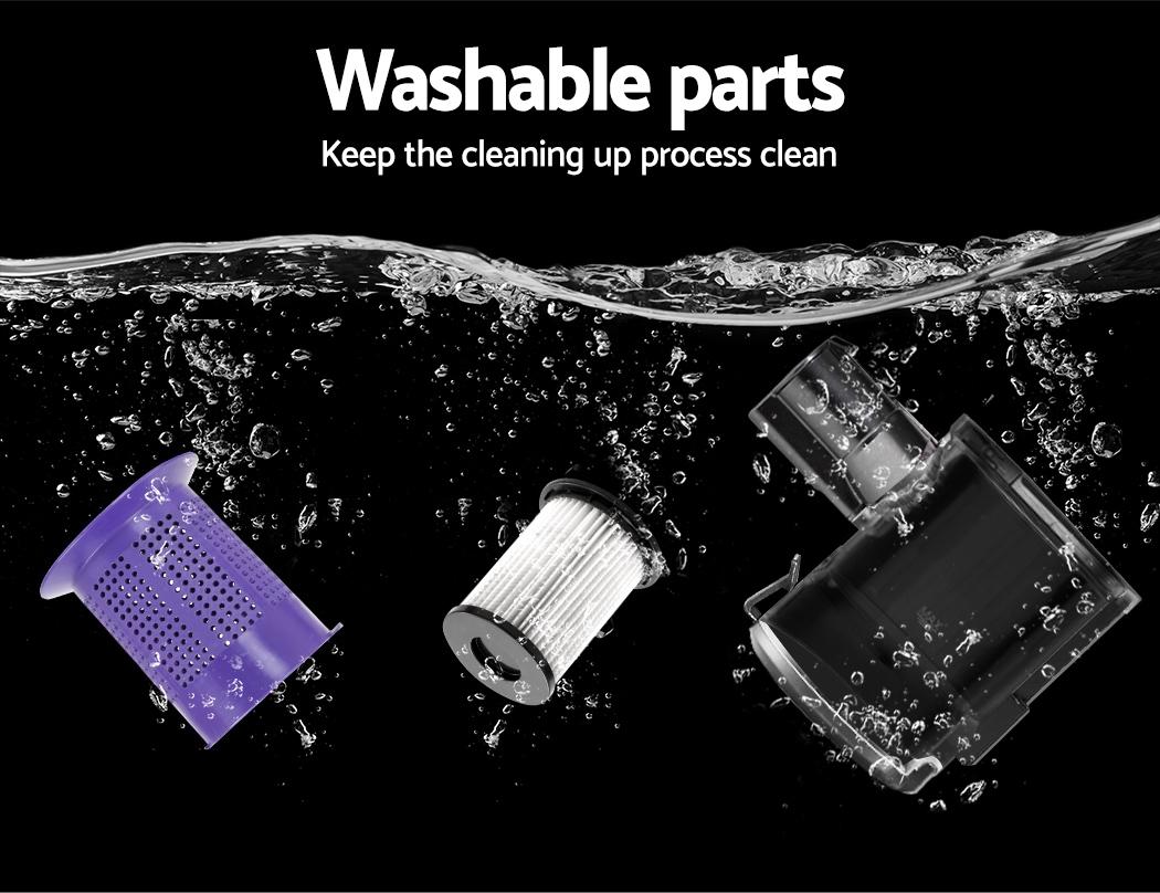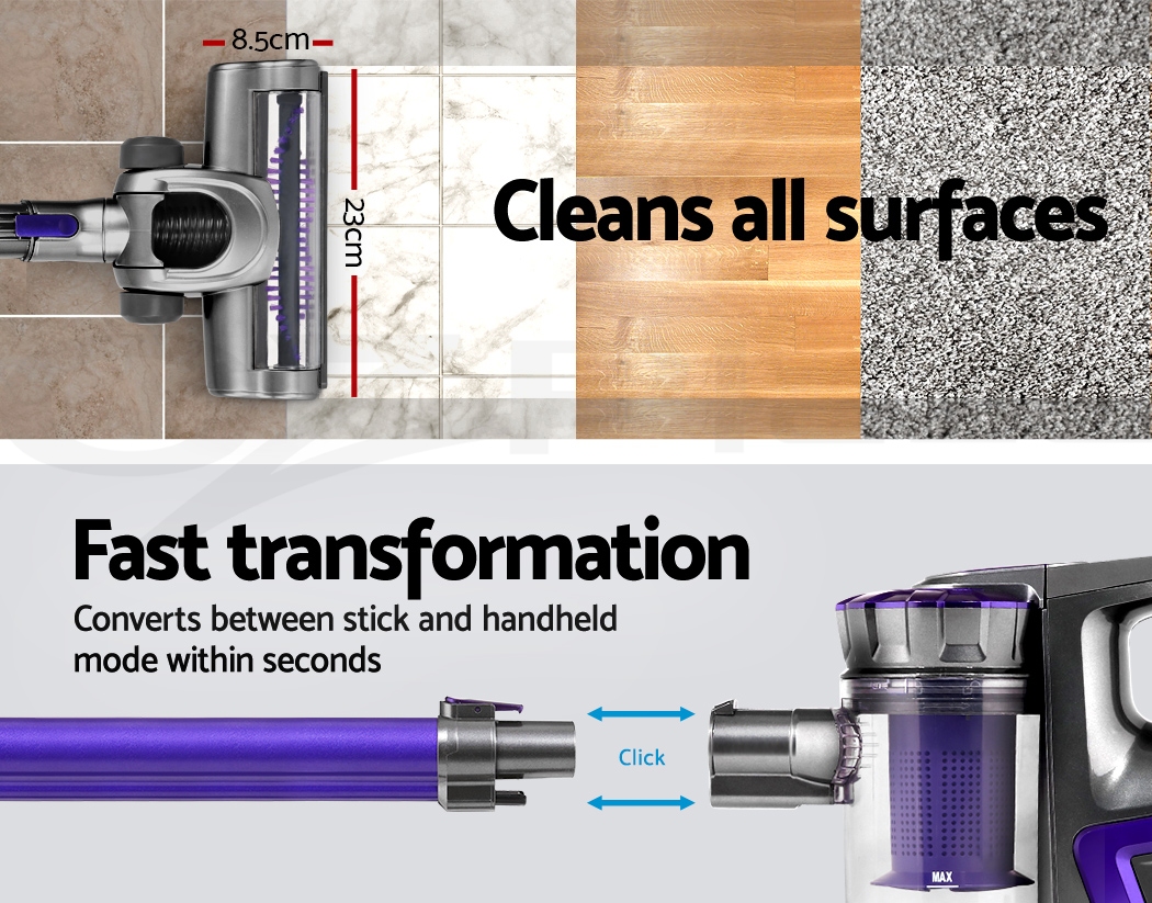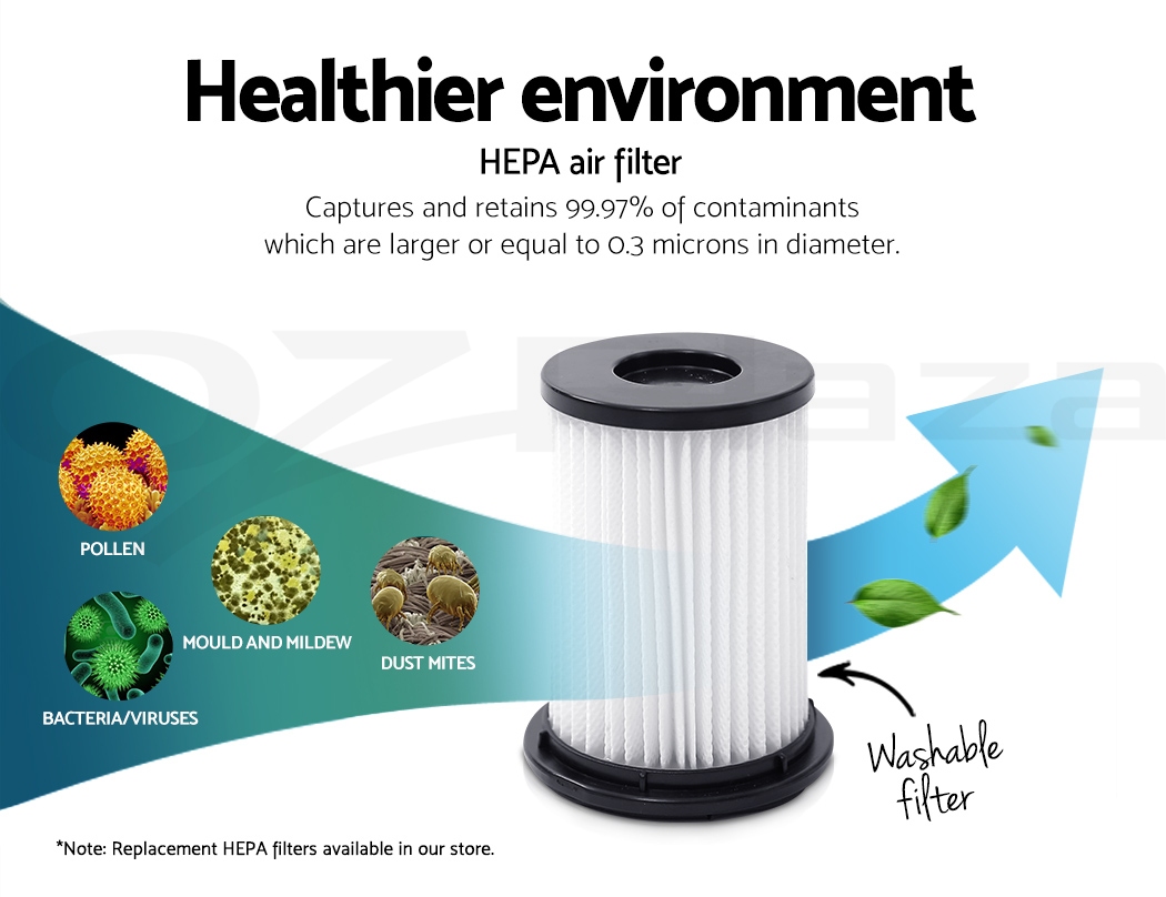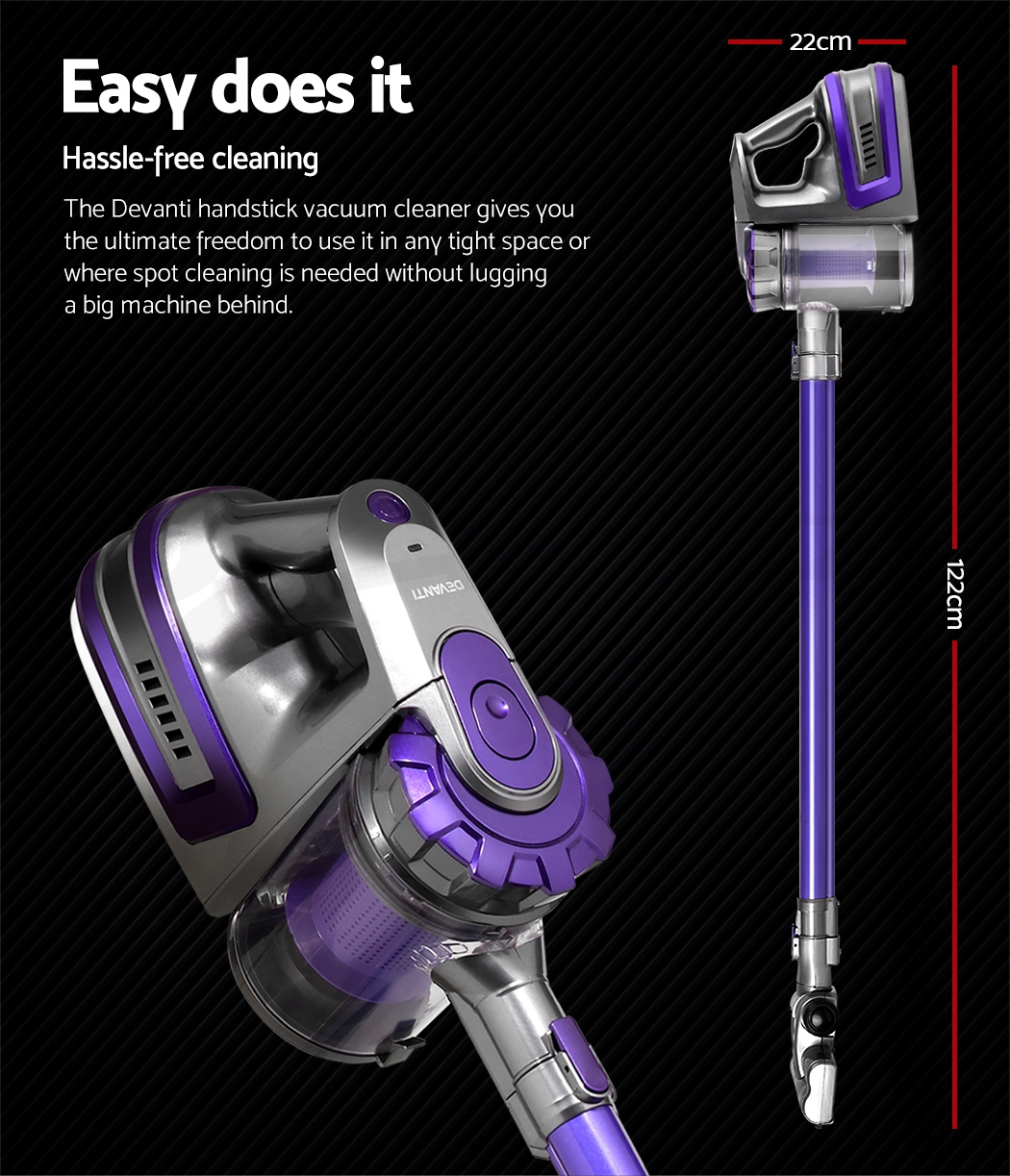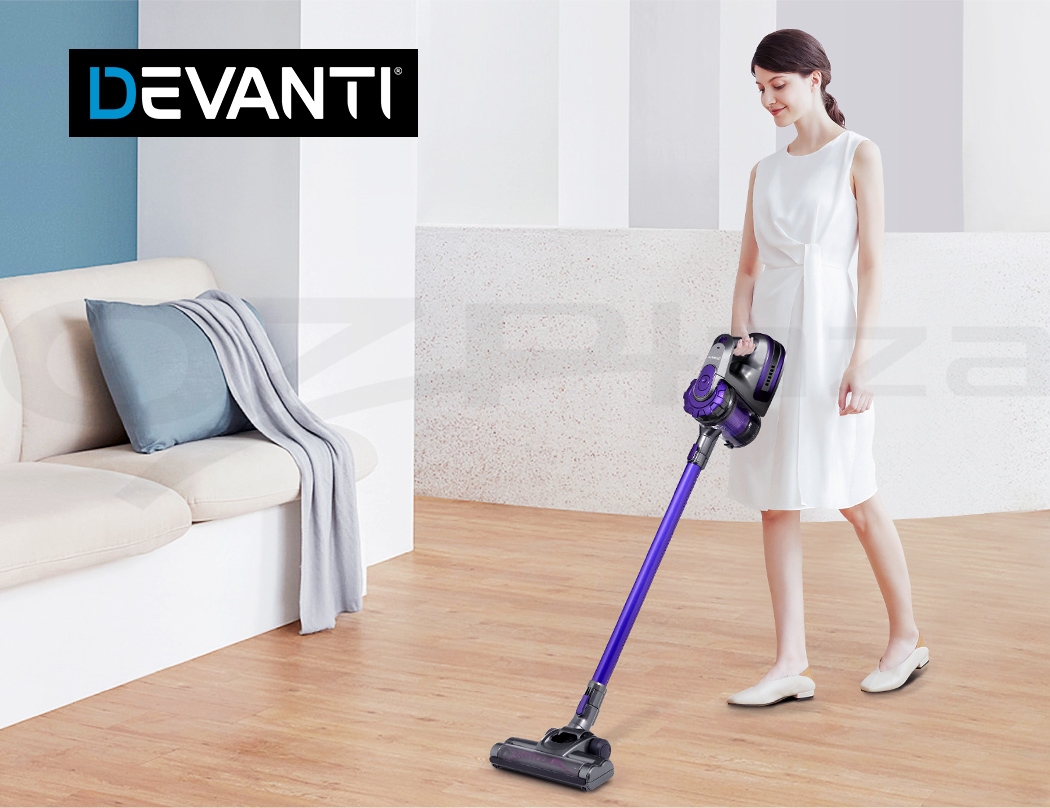 The Devanti Handstick Vacuum works as a normal stick vacuum and, with just a removal of the stick, instantly becomes a handstick vacuum. Its powerful 150W 30000rpm motorized head has a steady suction power of up to 8000Pa. And a 160° swivelling head that can be fitted with optional brushes and nozzles for different types of surface and zone cleaning also allows it to pick up dirt, debris and anything in its path easily. The one-handed design is lightweight and bagless. All collected dirt and debris pass through a washable and reusable HEPA filter that eliminates up to 99.97% of dust and allergens. Not least, the rechargeable 2000mAH lithium-ion battery can run continuously up to 35 minutes on a full charge.