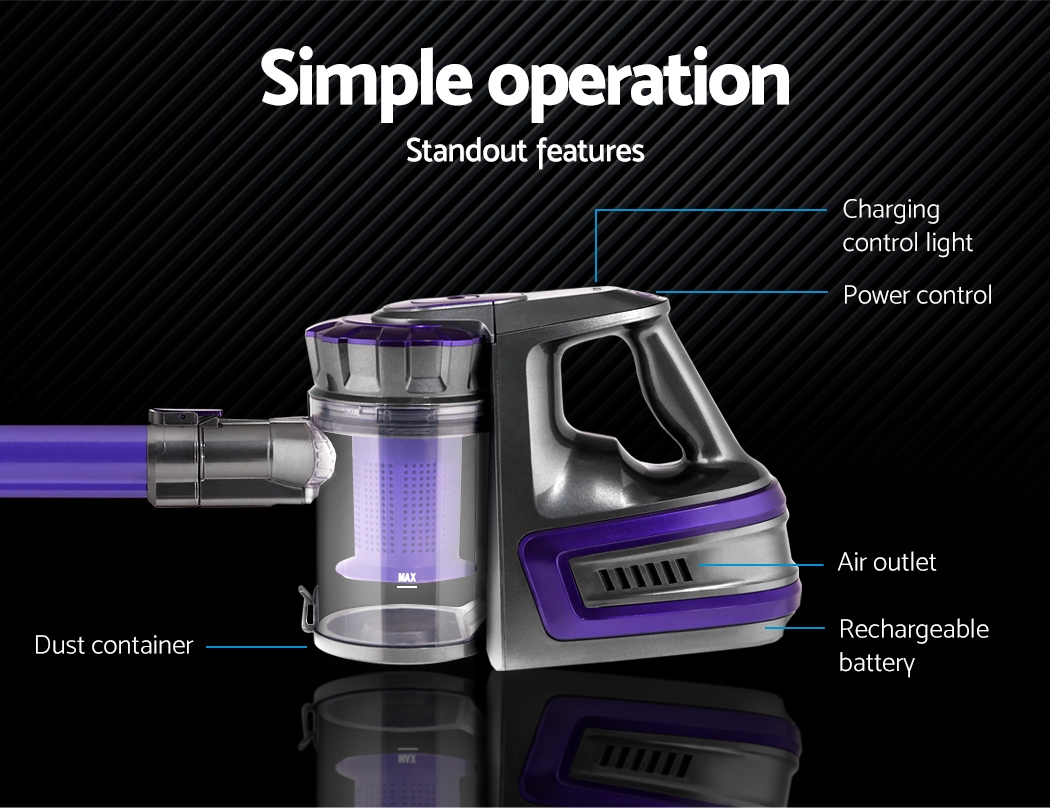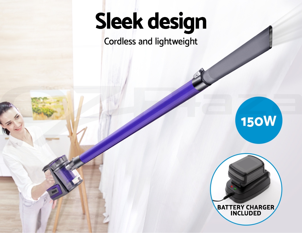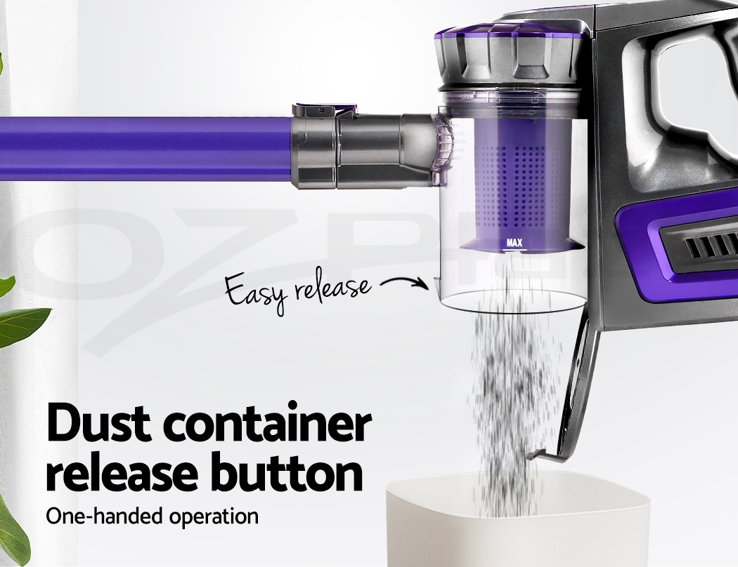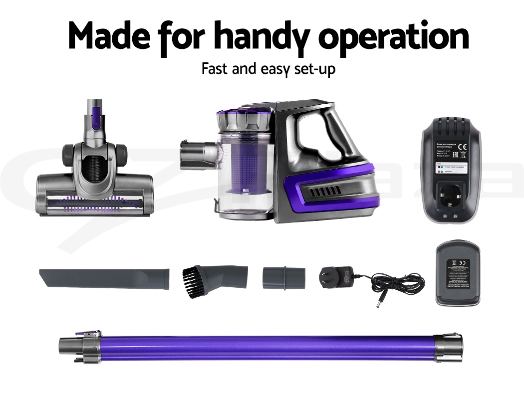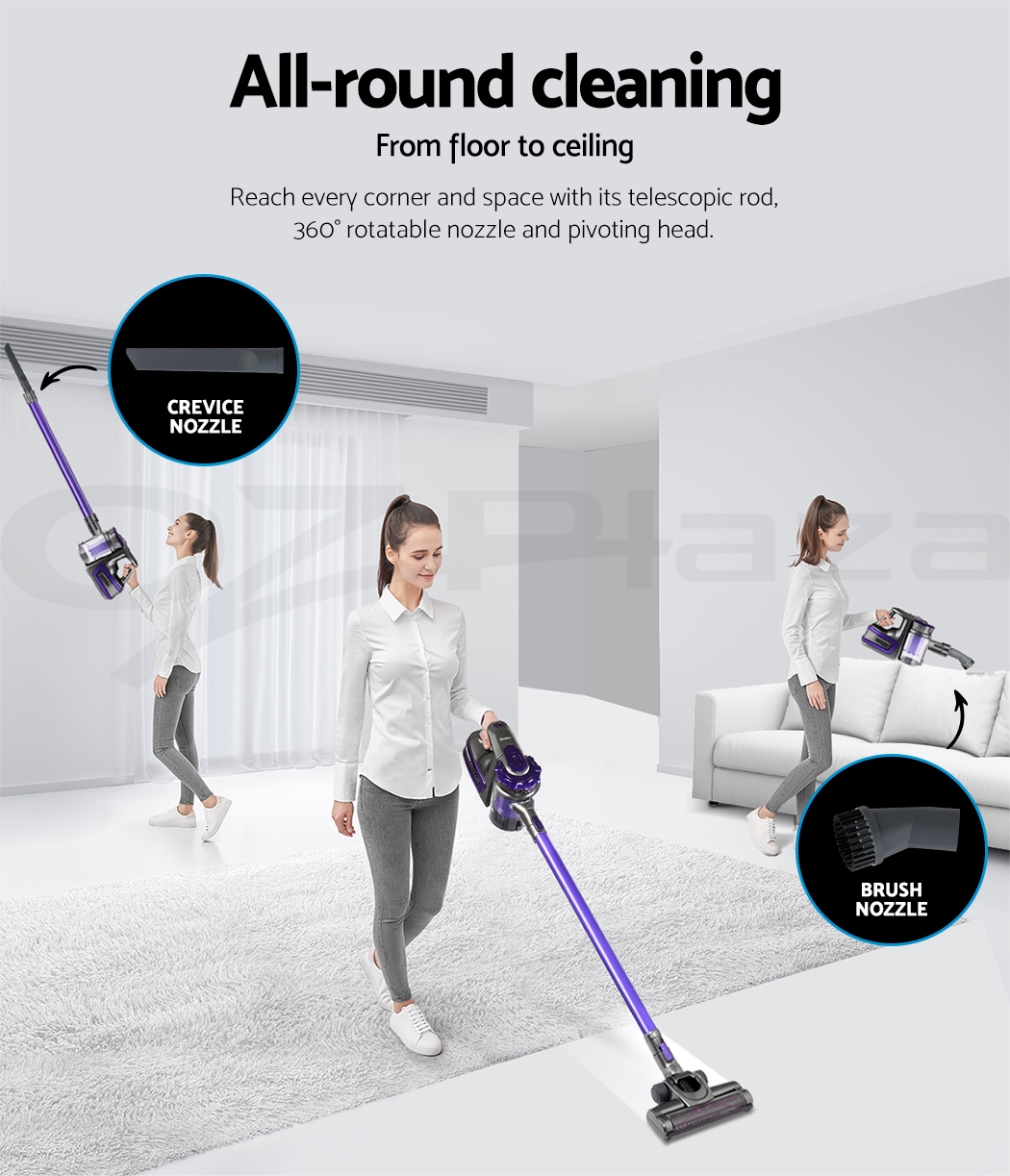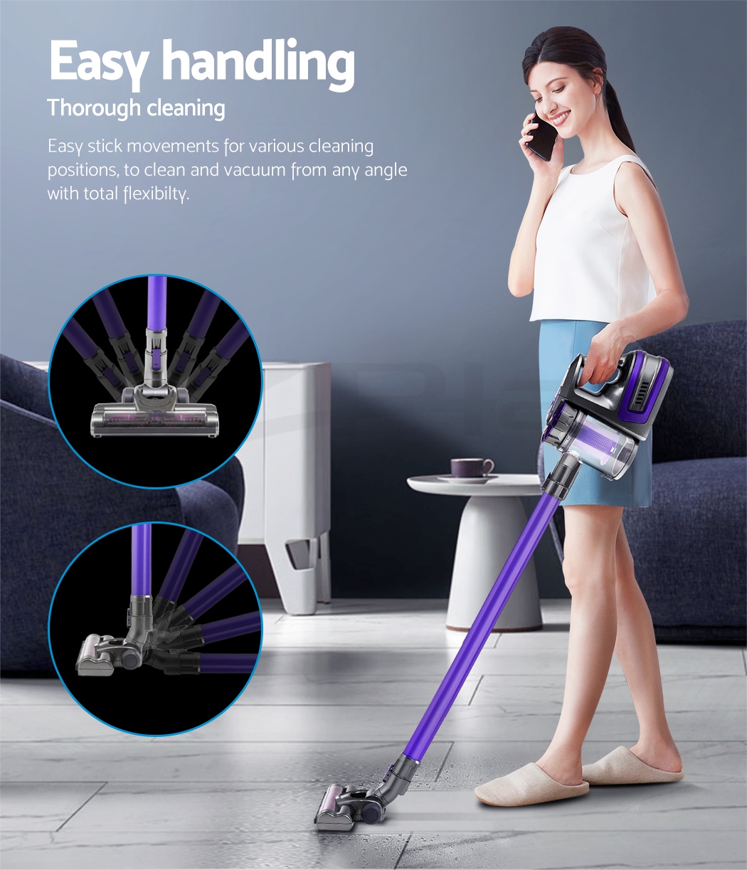 The Devanti Handstick Vacuum works as a normal stick vacuum and, with just a removal of the stick, instantly becomes a handstick vacuum. Its powerful 150W 30000rpm motorized head has a steady suction power of up to 8000Pa. And a 160° swivelling head that can be fitted with optional brushes and nozzles for different types of surface and zone cleaning also allows it to pick up dirt, debris and anything in its path easily. The one-handed design is lightweight and bagless. All collected dirt and debris pass through a washable and reusable HEPA filter that eliminates up to 99.97% of dust and allergens. Not least, the rechargeable 2000mAH lithium-ion battery can run continuously up to 35 minutes on a full charge.