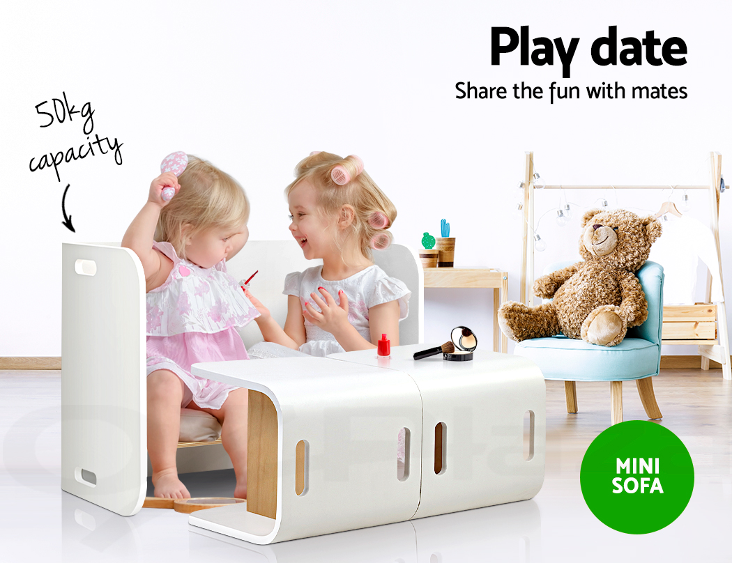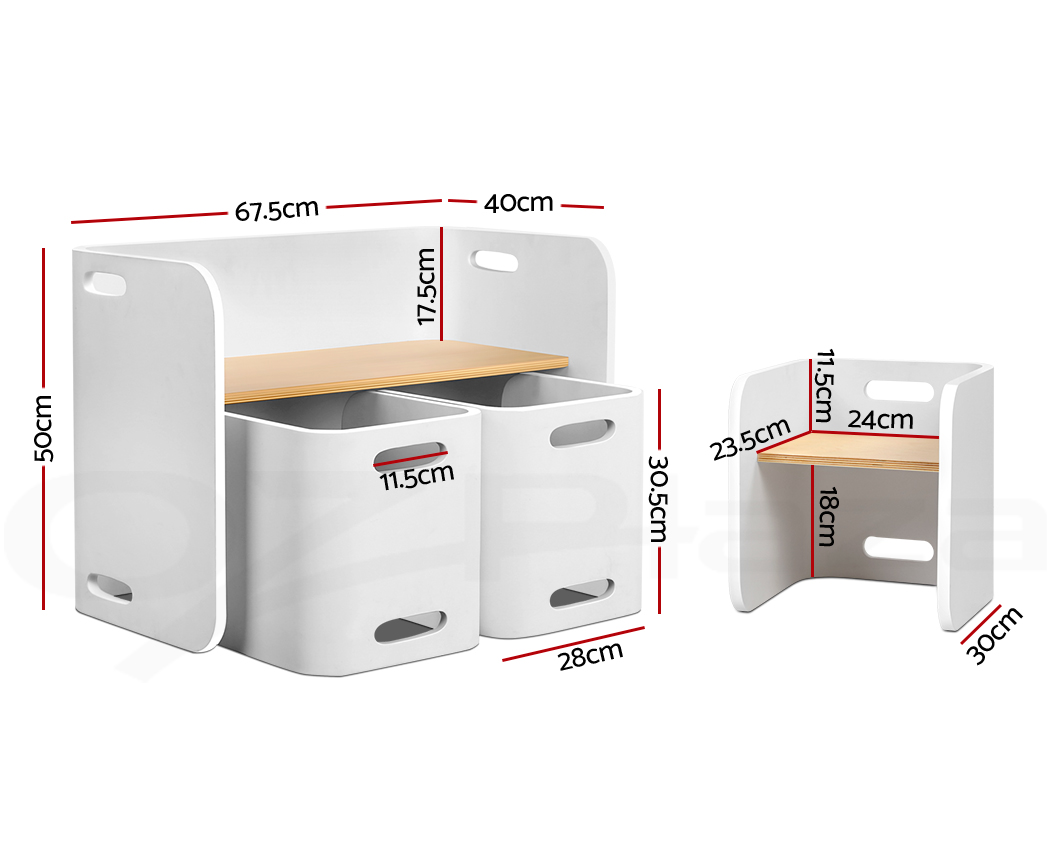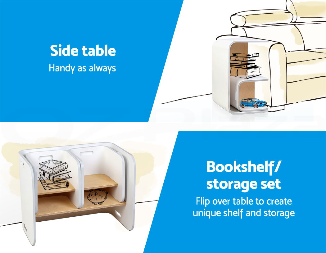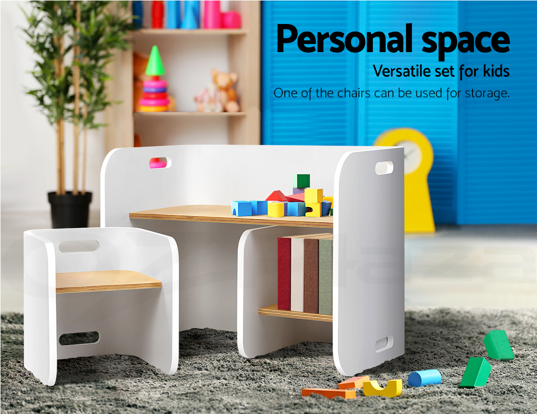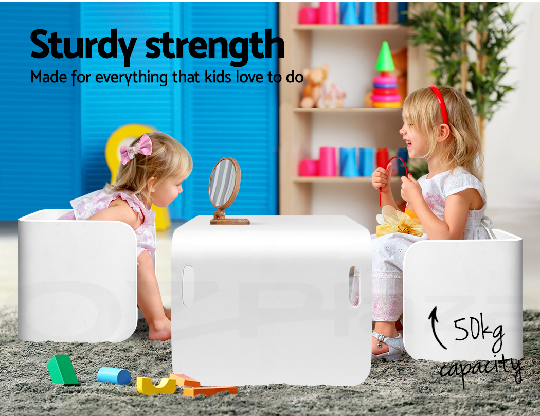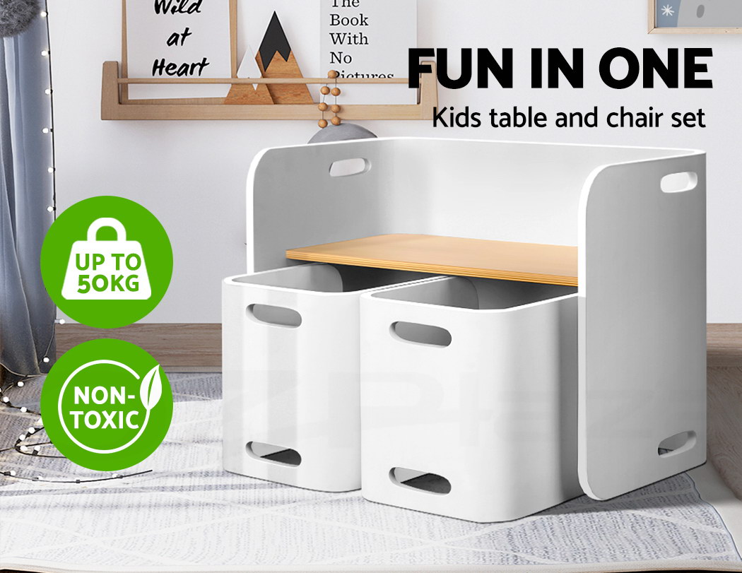 Give your kids they need to study, create and have fun with our compact Kids Table and Chairs Set. Made of birch plywood, the ensemble is strong and sturdy and designed to be child-safe with round corners, easy-grip handles and smooth surfaces. Perfect for reading, writing, art and craft or even having meals, the table has a weight capacity of 50kg. Likewise, the chair can take up to 50kg in weight and are made at just the right height and width for comfortable sitting. Not least, the set is easy to clean and maintain with its non-toxic finish. Its unique design also enable the set to be use in a variety of ways, such as a side table, storage shelf or even as a TV stand.