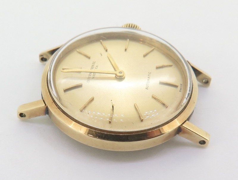 Vintage IWC International Watch Co Ladies Automatic Wrist Watch 2298. The original champagne dial with raised gold batons and matching hands is signed International watch co automatic. The automatic movement is working but will need a service. The gold plated 24 mm case with steel snap back is signed in the back international watch co 2298. Lug size 12mm. No Reserve!