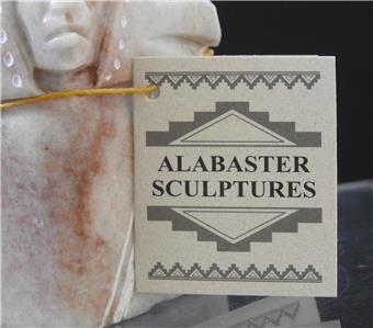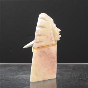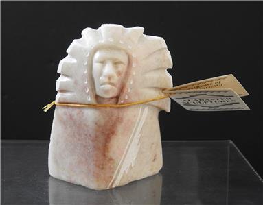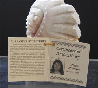 This is a Native American Indian artisan handmade carved and etched alabaster sculpture in a chief with headdress design or pattern by Diana Blueeyes, Navajo. It comes with a COA from the artist and is about 4 inches tall. This is a "new from the artist" piece of art sculpture!!!!
