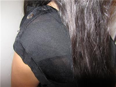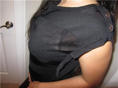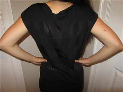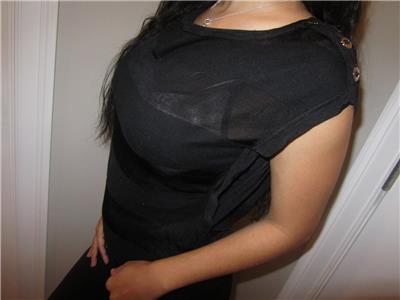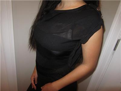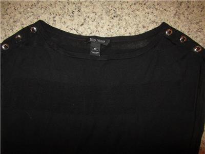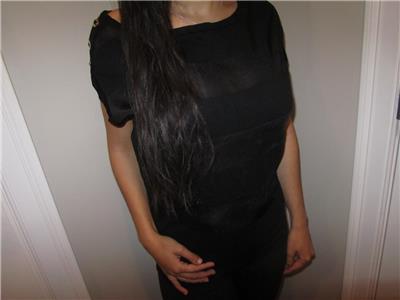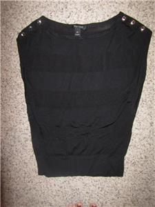 You are looking at a Trendy White House Black Market Cap Sleeve Shirt with 3 silver buttons on each Shoulder. Soft and Silky Vicose/Cotton. There is stretch for a Great fit. Black with Rows of Semi Sheer Black Stripes. Wider Rounded Neck and a banded hem. Great for all Seasons and Ocassions.. Looks sooo Much better on! Great shape..Paid almost $70.00 for it!