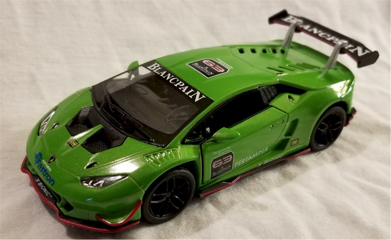 This is a Brand New Kinsmart - 1:36 Scale Model Lamborghini Huracan LP620-2 Super Trofeo Green. The model is about 4.75 inches long. This model comes with pull back & go and opening doors features. These models come in a big display box and they don't have individual boxes. They will be expertly packed and shipped.