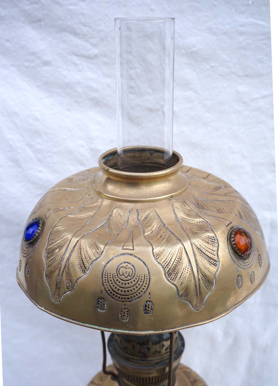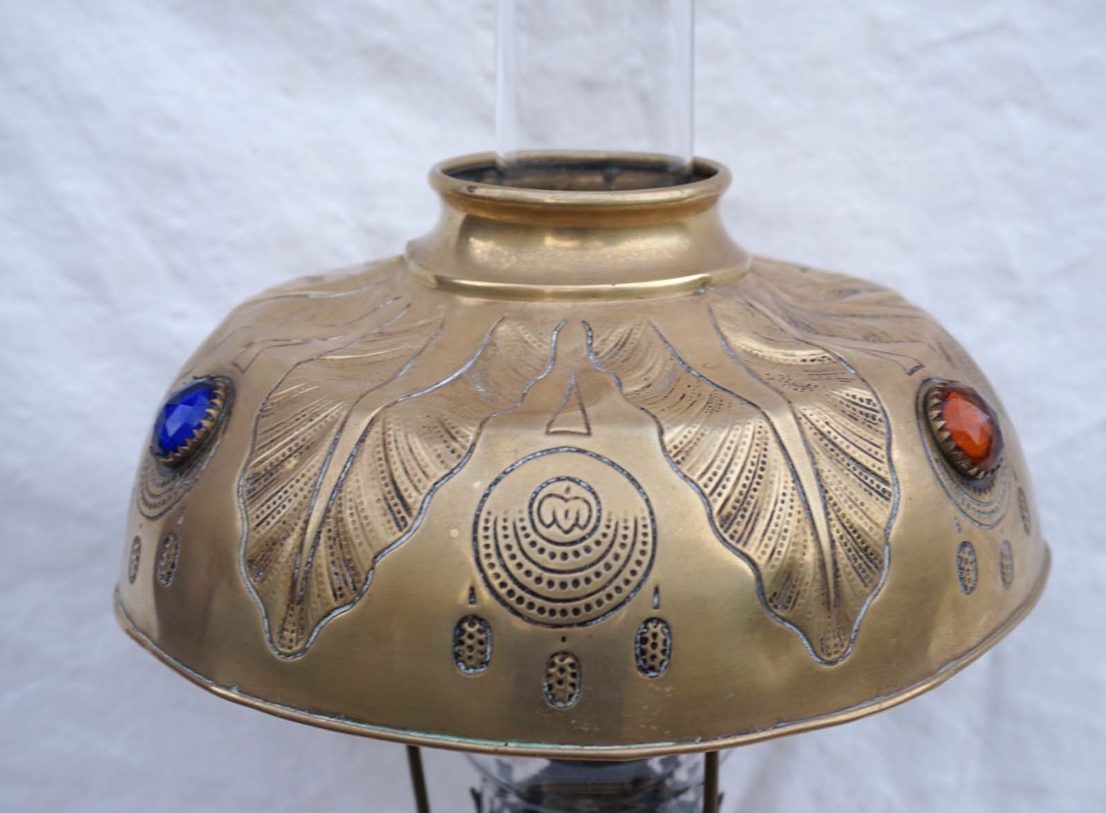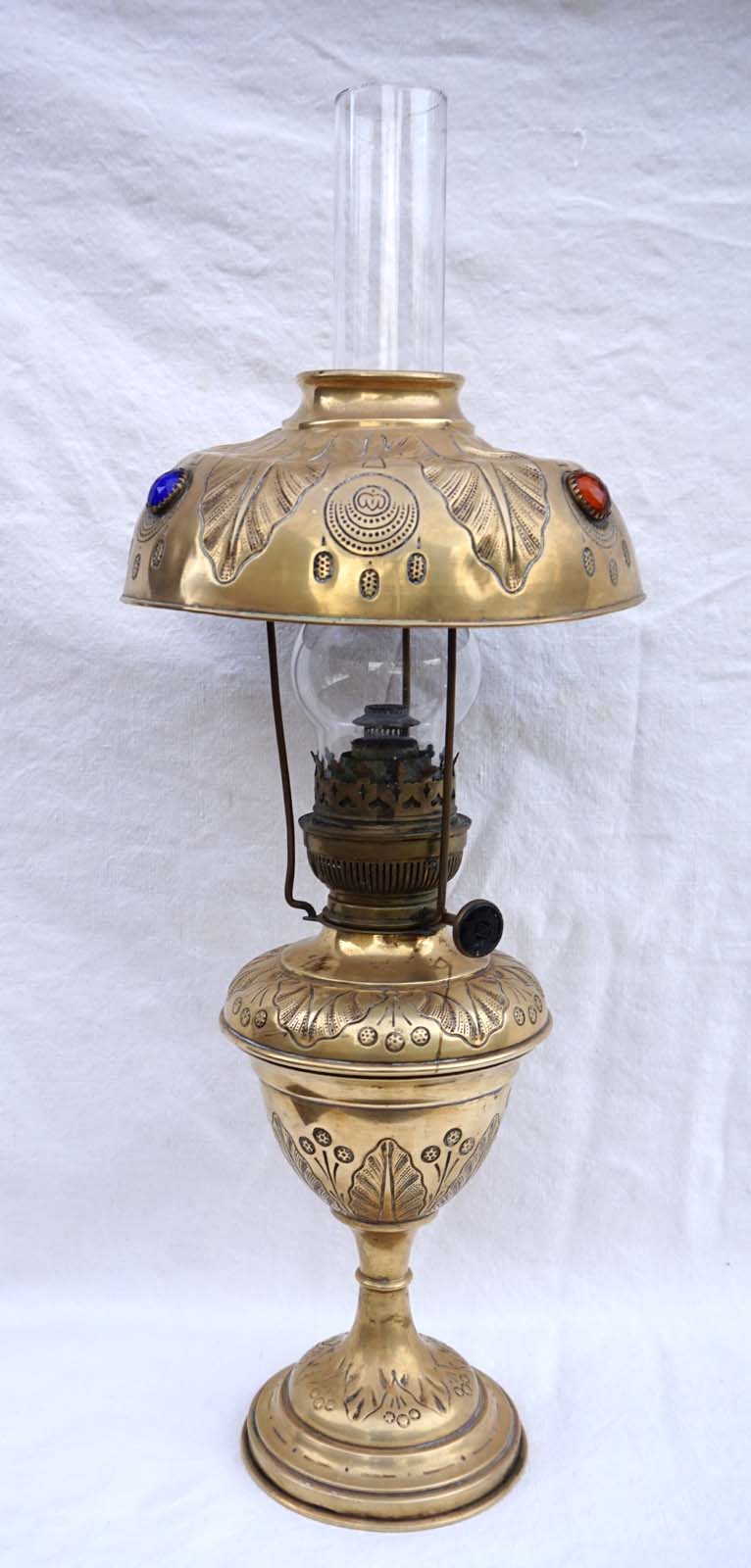 French Art Nouveau engraved copper oil lamp with shade enhanced with colored cut glass cabochons and Hasag Burner, Hugo Schneider to Lipzig, made during the 1895's.THe burner works perfectly, the lamp comes with its original glass and wick. 21 5/8" (55cm) height overall, 11 3/4" (30cm) height of the foot, 8" (20,5cm) diameter of the shade. Beautiful condition, a few small bumps on the shade as shown by the following pictures. The shipping cost for US and Canada is $35 with 4/6 days for delivery with official delivery service "La Poste" |