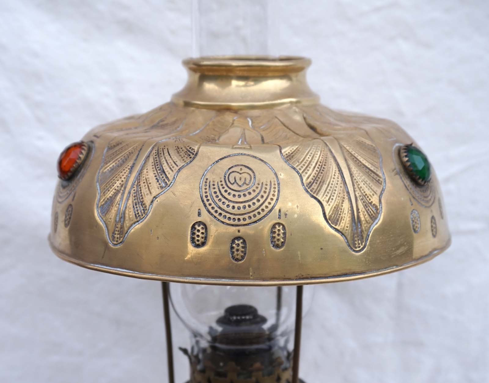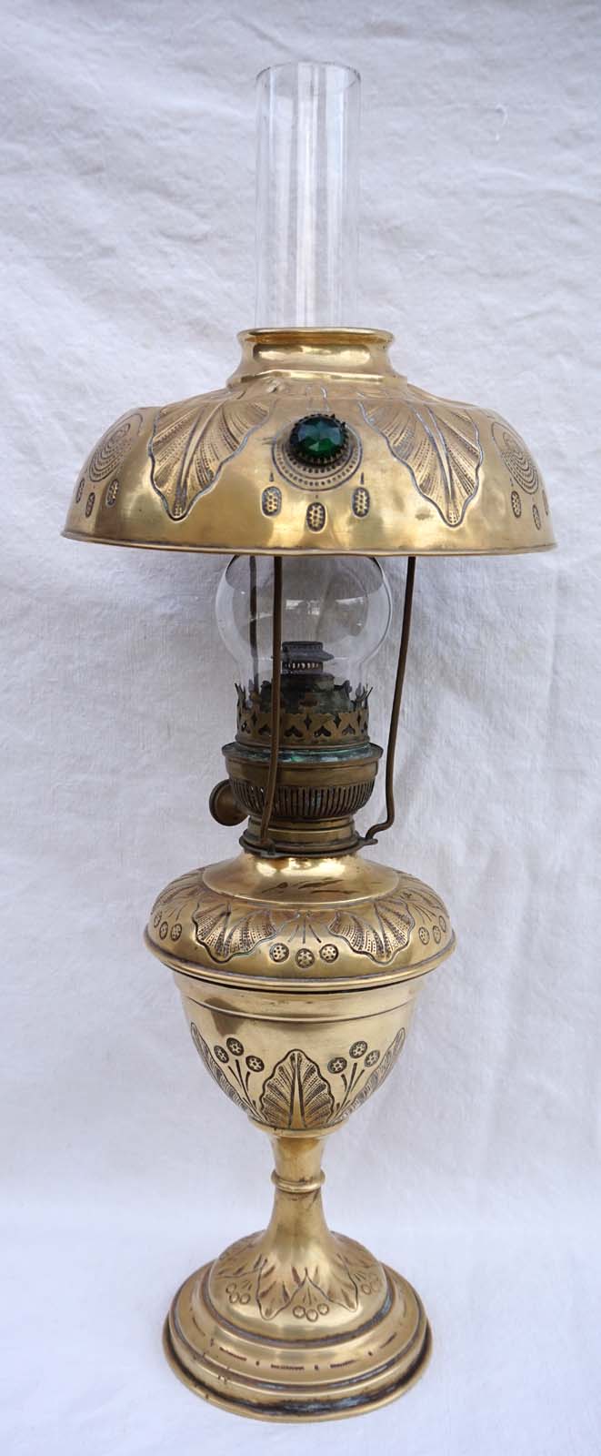 Leipzig, vers 1895. Lampe dite Hasag en laiton repoussé avec abat jour