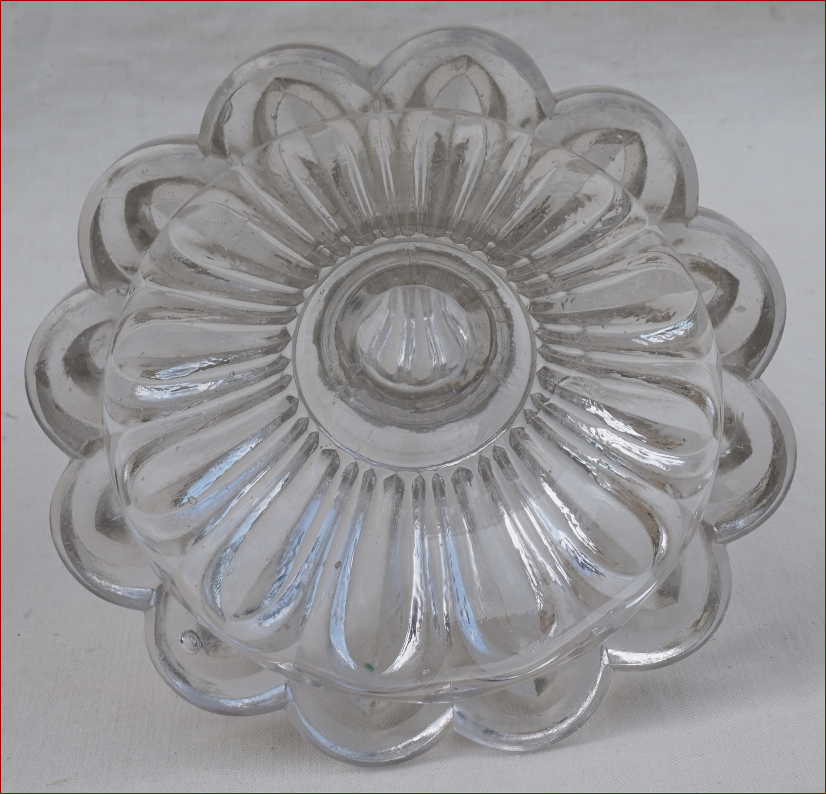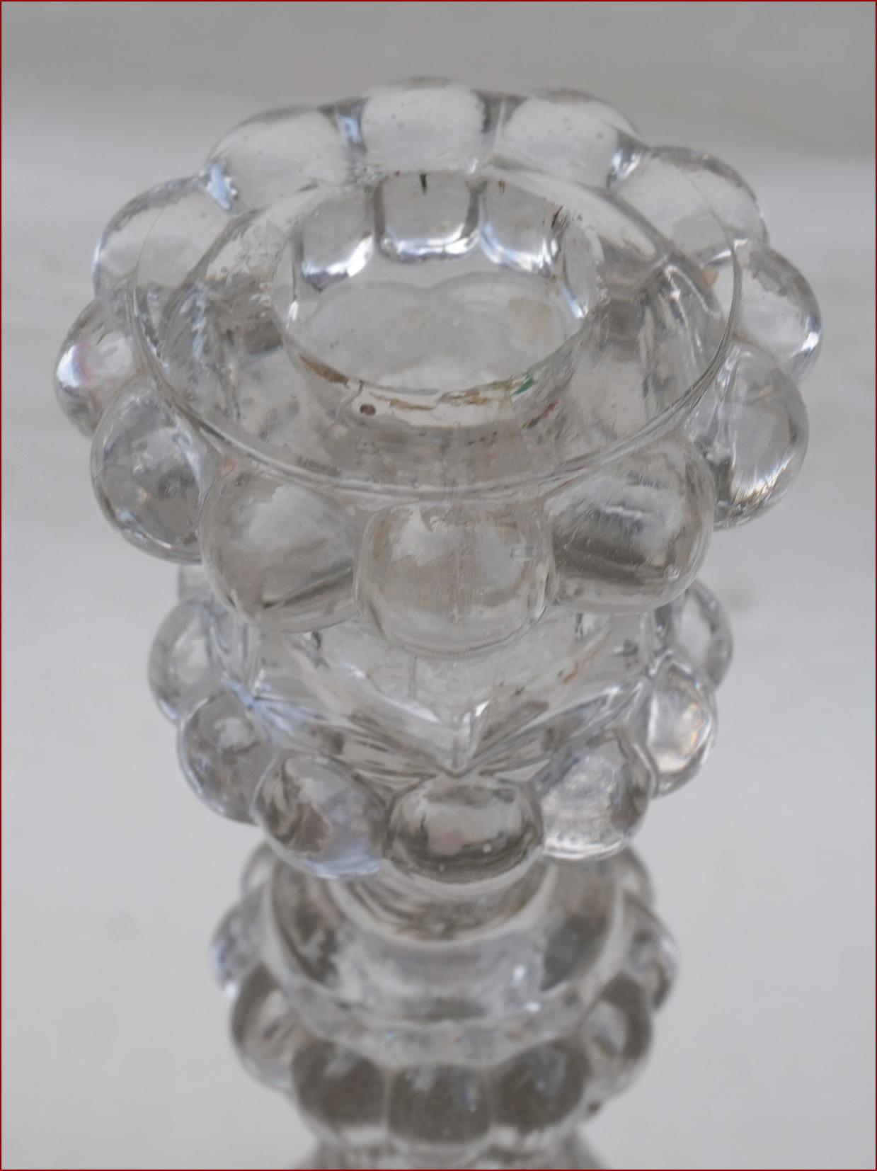 | For our French-speaking friends: Bougeoir en verre pressé, Vallerysthal ? Portieux ?, vers 1910. Bel état, juste quelques petites égrenures au col à l'emplacement de la bougie. Hauteur 24cm, diamètre au pied 14.3cm. |