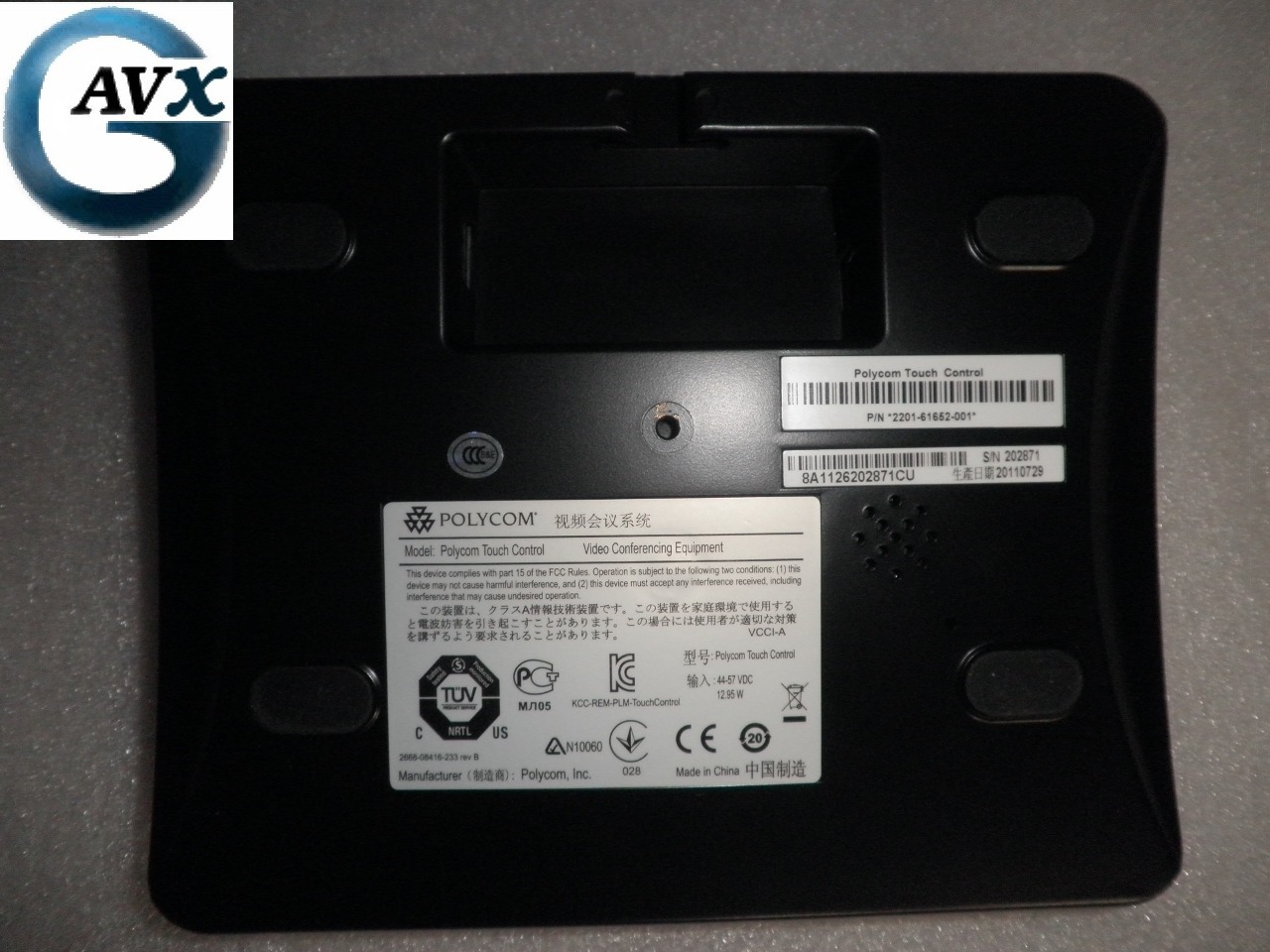 | Relax... GAVX Value is in the Details This Touch Control will be packaged professionally. GAVX packages each component individually protected from damage with original packaging material, a foam bag, bubble bag, or bubblewrap. Components will not be allowed to shift inside the package. There will be a minimum of 2 inches protecting each component from the exterior of the box. This system will come with 90 day warranty from GAVX. We will provide two hours of free technical installation support with the end user purchaser and ongoing trouble resolution, if necessary, during the warranty period. We are a Polycom certified dealer for videoconference equipment currently being manufactured by Polycom. GAVX No Remorse Upgrade Option: If you purchase this system and decide that it works well but want a new Polycom system, you may trade the Polycom you purchase from us, at full purchase value, toward a new Polycom videoconference system at any time within the first 90 days. | Included Components - Refurbished Polycom Touch Control Base Unit