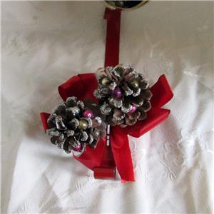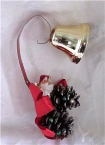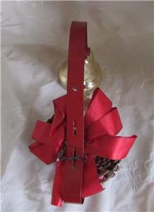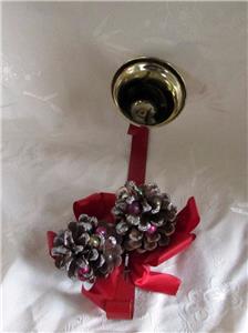 DescriptionThis is a vintage over the door hanging Christmas Bell. The bell holder is red painted metal and the bell is gold. There are glittery pine cones and tiny red ornaments along with a red satin bow at the bottom. There is even a small white felt angel. It can either be hung over a door and attached to door.