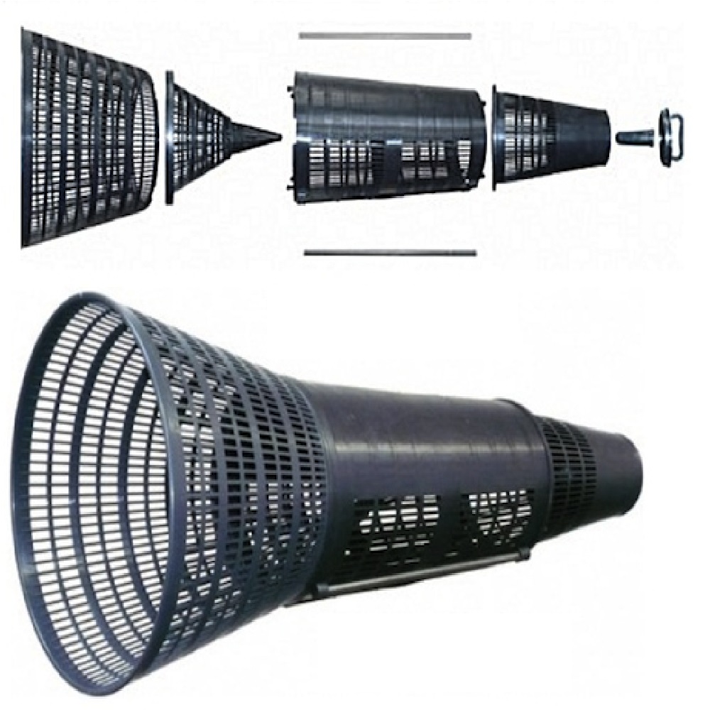 Weiterentwicklung der bekannten Stucki- Reuse mit 10 % größerem Einlauftrichter, größerem Abstand zwischen Kehle und Kappe, Kappe mit Schraubverschluss und aufsteckbarem Köderkorb, hergestellt aus elastischem Kunststoff mit guter UV- Beständigkeit.