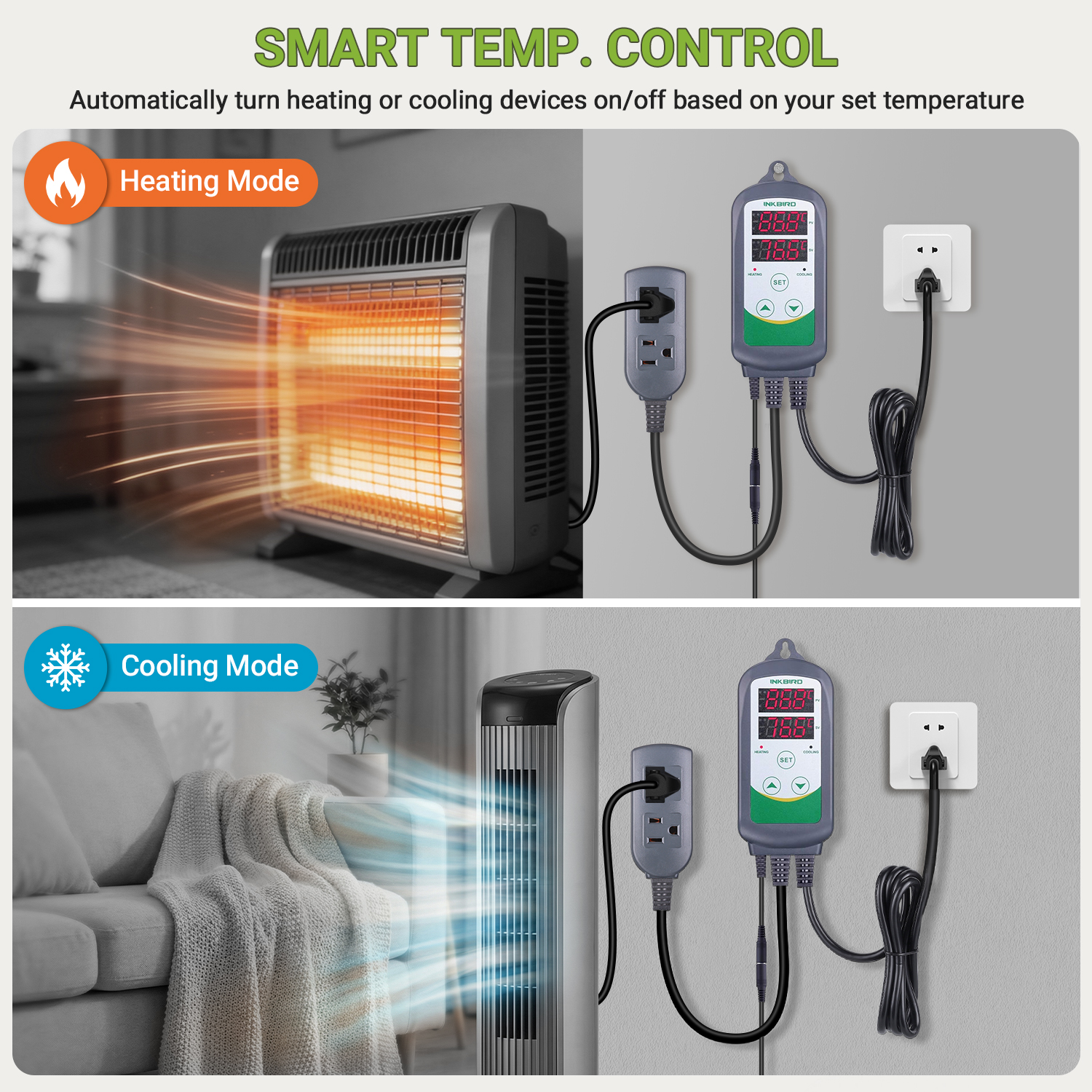 - With 2 sockets output, one for heating and another one for cooling.