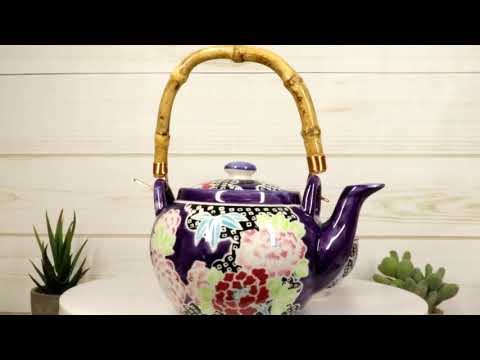 • This beautiful porcelain tea pot set serves four people, containing 1 teapot(25oz) with bamboo handle, strainer and 4 tea cups. Our traditionally crafted bowls are made of the highest quality porcelain available and fired at a high temperature to maximize the strength of the porcelain, making them superior to other ceramics in the market. Our bowls are more resistant to cracks, stains, and scratches. Our porcelain is food safe and contain no lead or cadmium. • Tea pot measurements: 5"H by 7.25"L by 5.25" W approximately without the handle. Tea Cup measurements: 2"H and 3" in Diameter with 4 ounce capacity each. • The teapot set with cups weigh approximately 2.25 pounds. They are dishwasher and microwave safe IF you remove the metal strainer and the wooden handle. DO NOT microwave the teapot with the metal strainer and wooden handle still attached to the pot. • Beauty and elegance is presented in the design of this earthenware tea pot set. With the base color of rich deep space purple, the teapot is adorned with large colorful floral blossoms. This teapot is styled with a fusion of Victorian and Asian themes. The teacups are matching in design, making this tea pot set a delightful decor, serve-ware for tea time or gift for any occasion! • This is an Ebros Gift exclusive collection. It comes with our Ebros Gift Satisfaction Guarantee when sold by Ebros Gift.