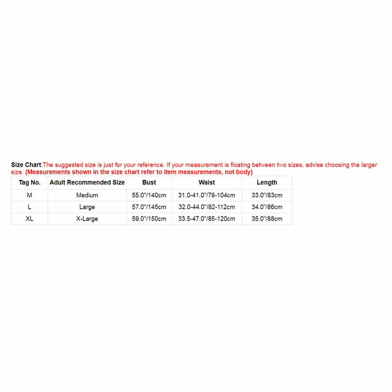 | Tag No. | Adult Recommended Size | Bust | Length(excluded straps) |