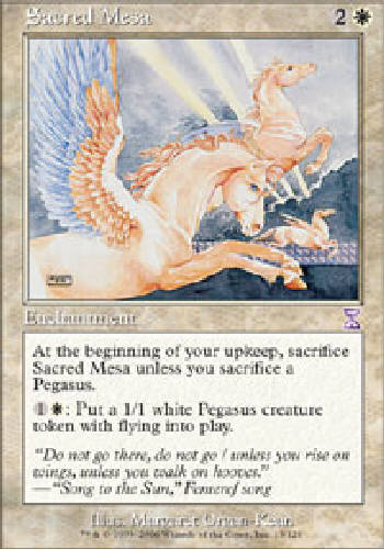 SACRED MESA: Enchantment, At the beginning of your upkeep, sacrifice Sacred Mesa unless you sacrifice a Pegasus. 1W: Put a 1/1 white Pegasus creature token with flying into play. RarityTimeshifted ColorWhite TypeEnchantment Mana2W Cost3 SetTimeSpiral SetTimeSpiralBlock