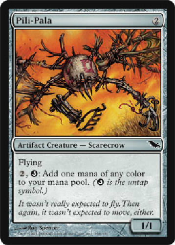 PILI-PALA: Artifact Creature - Scarecrow, Flying 2, oQ: Add one mana of any color to your mana pool. (oQ is the untap symbol.) RarityCommon ColorArtifact TypeArtifact Power1 Toughness1 Mana2 Cost2 SetShadowmoor SetShadowmoorBlock