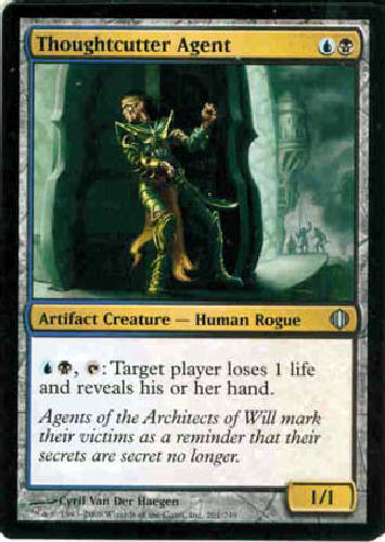 THOUGHTCUTTER AGENT: Artifact Creature - Human Rogue, UB, T Target player loses 1 life and reveals his or her hand. RarityUncommon ColorMulti TypeArtifact TypeCreature Power1 Toughness1 ManaUB Cost2 SetShardsOfAlara SetAlaraBlock