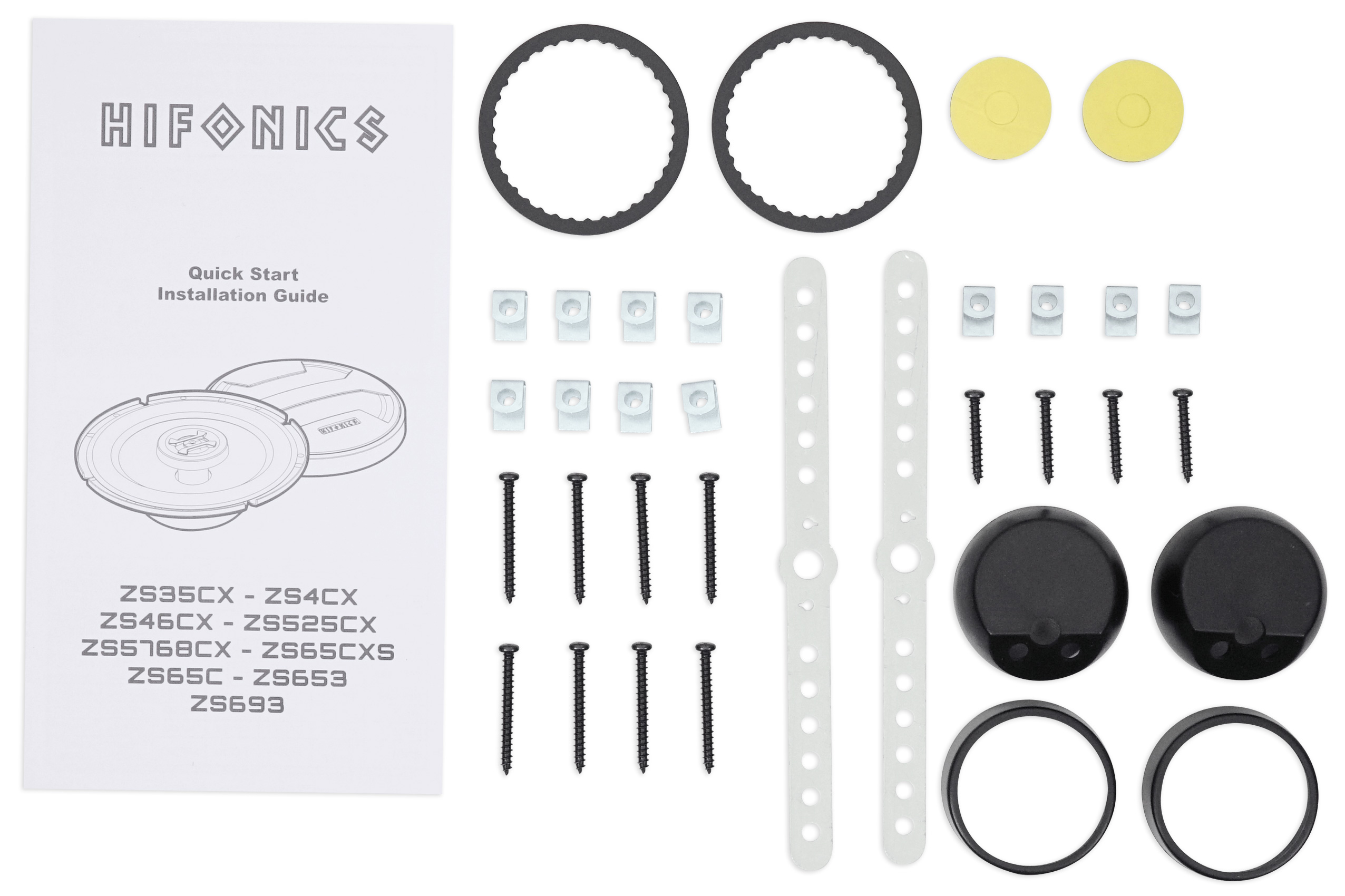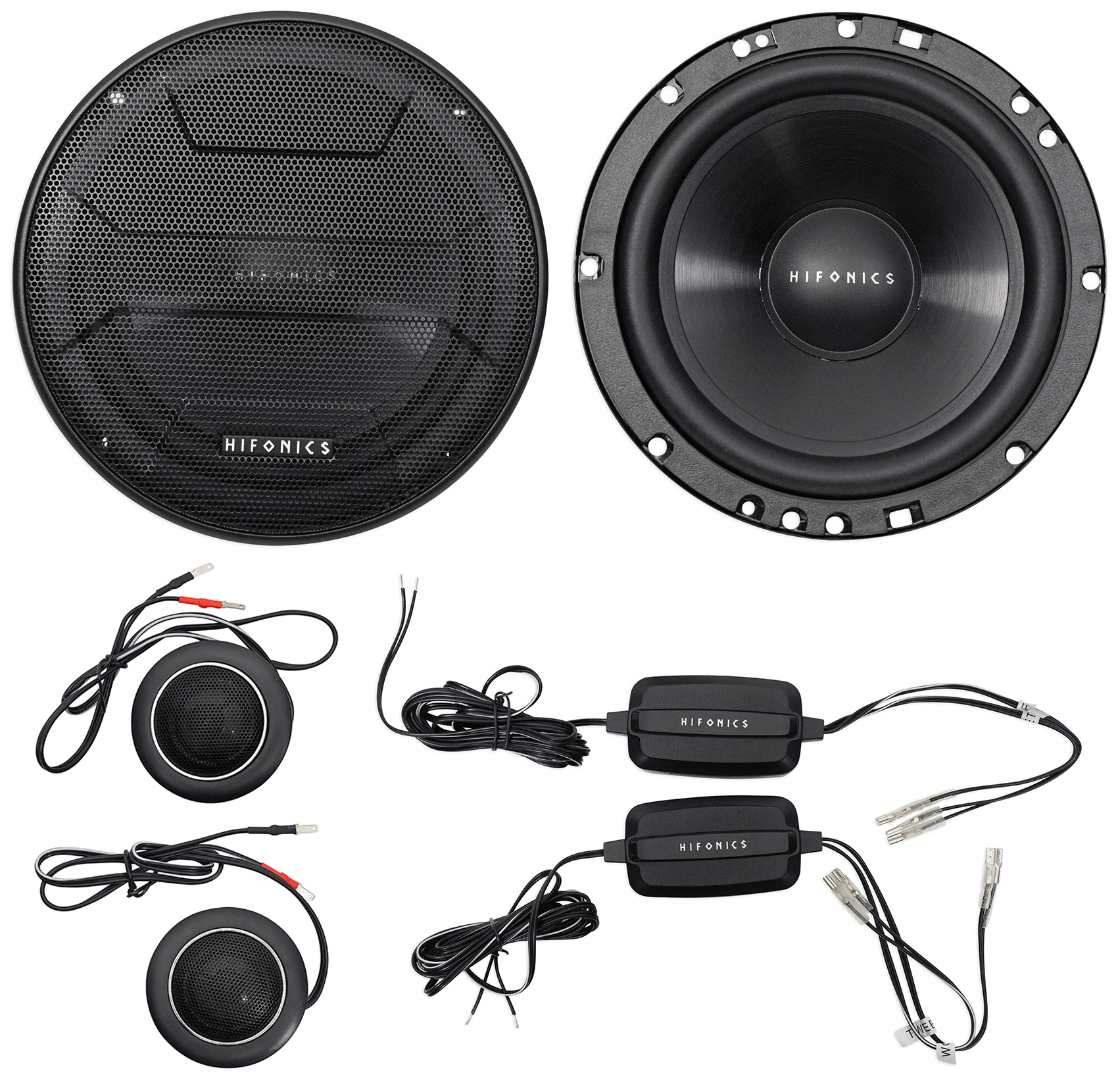 Hifonics Zeus 6.5 inch 2 way car audio component speaker system with neo-Mylar dome tweeter and Alpha-Cellulose Poly Woofer Cones nylon surrounds (pair) Includes 12dB in-line crossover and all tweeter mounting hardware and grills for the mid/woofers.